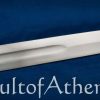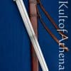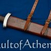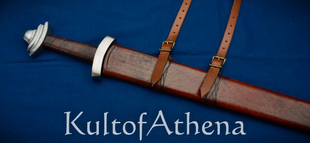 This Deepeeka 11th Century Viking Sword is made of high carbon steel. The crossguard and pommel are of steel and the grip is tightly wrapped in form-fitting brown leather. The wood-core scabbard is likewise covered in tightened leather and has two antiqued buckles to affix the scabbard to a sword belt.