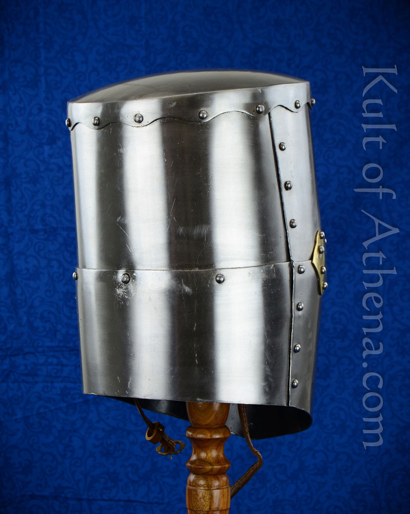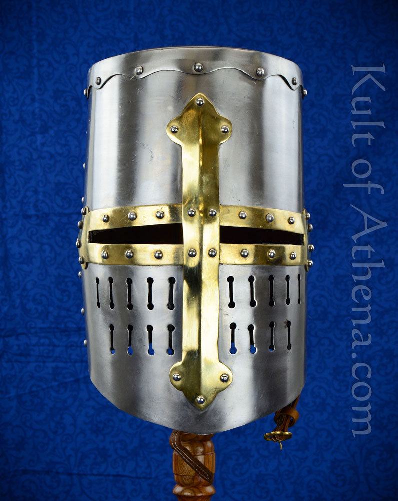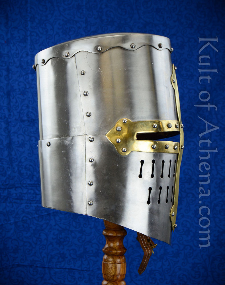 This Early 13th Century Great Helm is crafted from riveted plates of 16 gauge steel; the cross of brass has been stoutly riveted into form. The interior of the helm is blackened and is fitted with an internal suspension liner of canvas with padded interior – it can be adjusted to fit. A leather chin strap with an adjustable brass buckle completes this Great Helm.