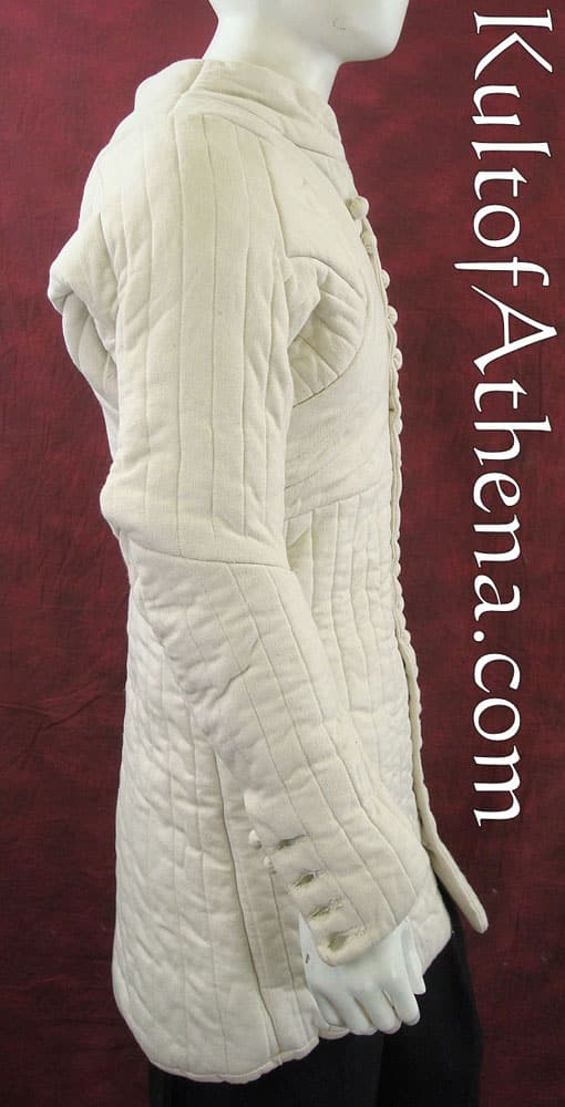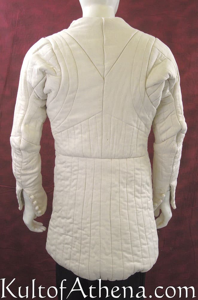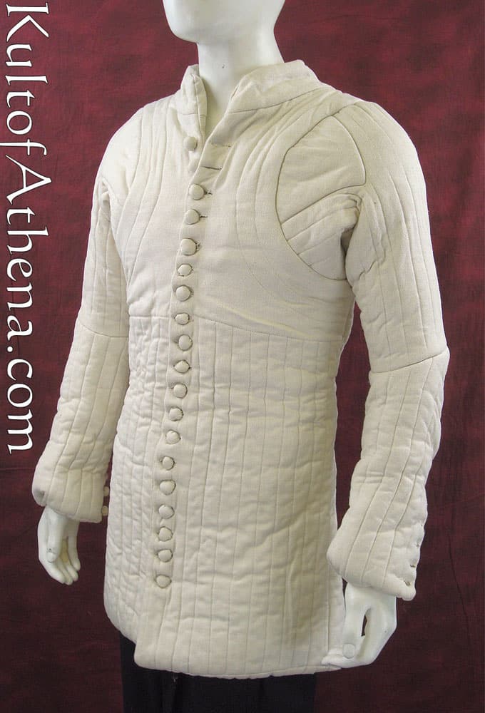 Gambeson I got this for a 14th century kit that I’ve been finishing up and I have to say… It really looks great! The fit for it is excellent and the padding isn’t too thick or thin for my use. The only complaints I have are that the buttons can come loose without proper care so be careful. Also… I probably should have bought the black one instead of white because the natural color stains like nobody’s business. Still a great product.