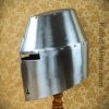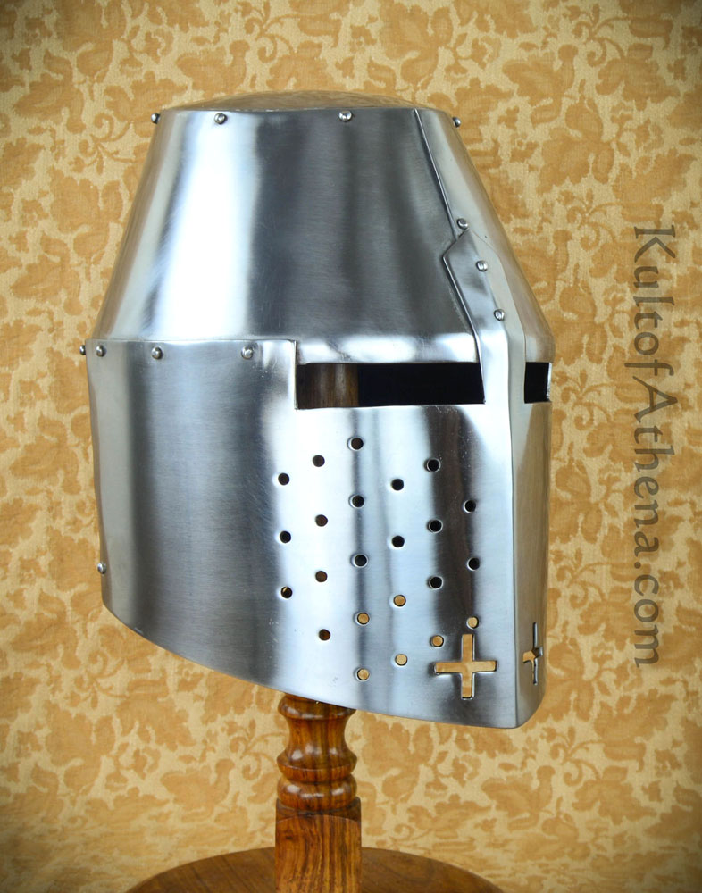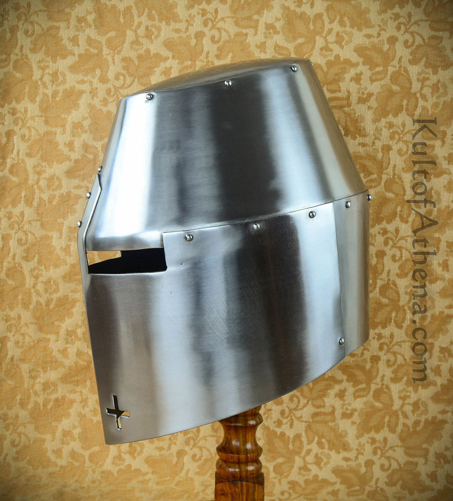 Exactly what I was hoping for… I received the helm today, and it far exceeded my hopes. What a helm! Not overly heavy, and with the beanie cap that came along with it, fits my 23-1/2” head with plenty of room for extra padding and a mail coif. I can wear my glasses under it, and there’s no ‘nose smushing’ like on some helms of this style advertised on-line. The polish is not 100% perfect, but I wasn’t expecting it to be. Nothing some Scotch-Brite and WD-40 won’t fix. :D I like my armor a soft, rubbed finish anyway. There are a few VERY minor things I would have done a little differently, but the overall quality of this piece makes up for it. Now, all that’s left to do is rivet in a chin strap and figure out my paint scheme. I had thought about fixing this up really fancy and re-selling it….I am having severe second thoughts about that. I just believe this will be a keeper. Anyone who loves the look of a great helm…you will NOT be disappointed here. Get one before they sell out and are gone for good. Best helm I own, hands down. And, last but not least, thanks to KoA and the UPS for getting this to me quickly and safely!