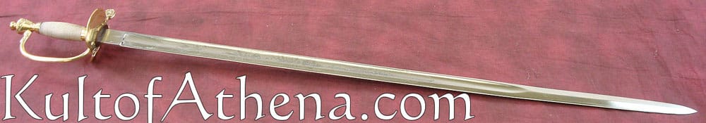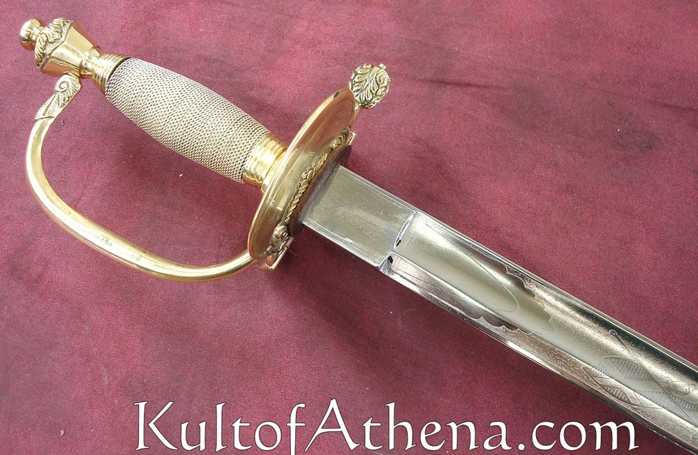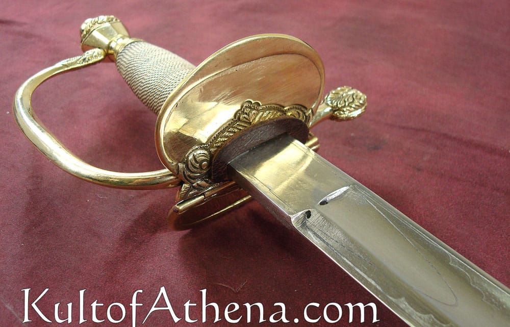 When the British Army standardized the swords to be carried by infantry officers in 1796 this is the sword they settled on; a spadroon-like cut-and-thrust sword with simple, but elegant Georgian styling that hearkened back to the Smallswords carried by gentlemen in earlier times. In just four years following, the blade was at the hip of practically all British Line Infantry Officers. Regardless of the standardization of form, the blades varied in their width and in their engraved decoration. Though widespread, it was not regarded as a good combat blade despite being used through the entirety of Britains contests with France in the Napoleonic Era. It would not be officially replaced until 1822 by the more elaborate Gothic-Hilted sword and before then many officers had opted to acquire the 1803 Pattern saber instead.
