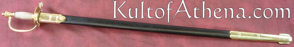 This replica of the 1796 British Infantry Officer sword has a blade of unsharpened, tempered high carbon steel. Both sides of the blade feature the embossed cyper of the British Crown surmounted extensively by royal devices and floral motifs. It has a hilt of brass and a grip wrapped in copper wire that is plated with silver. Half of the guard is hinged and folds for ease of carry at the hip. The scabbard is of leather with brass accents.