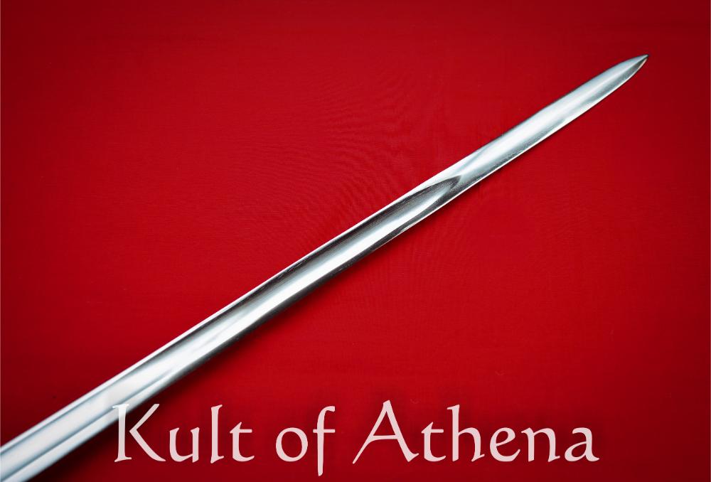 Firstly, this sword is not near the specs KuA advertises, or for that matter many other companies both in the U.S. and in EU that offer it. It is advertised by KuA as 1lb. 13.3oz (830 g) and by other sites as 883g (1lb 15oz); it is in fact 2.07lbs, or 940g. The blade is exactly 31″ in length and 10% thicker at the hilt than advertised (7.75mm vs. 7mm). Its POB is 6″, so the heavier blade does not compromise handling per se, even though the grip diameter foils optimum control. The grip is rather too small in diameter to allow good control of the piece, but thus may reflect the actual shortcoming of the original historical design. It does have more of a distal taper than most Universal offerings, but there is not as pronounced a blade taper to the tip as the actual historical sword, causing it to feel more tip-heavy than I expected. As delivered, the sword would not fully seat into the scabbard, leaving an inch of blade exposed, so filing must be done to both the scabbard throat and the blade.
