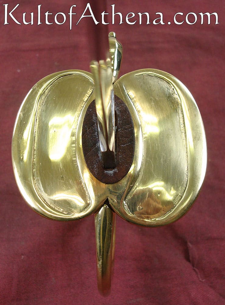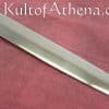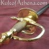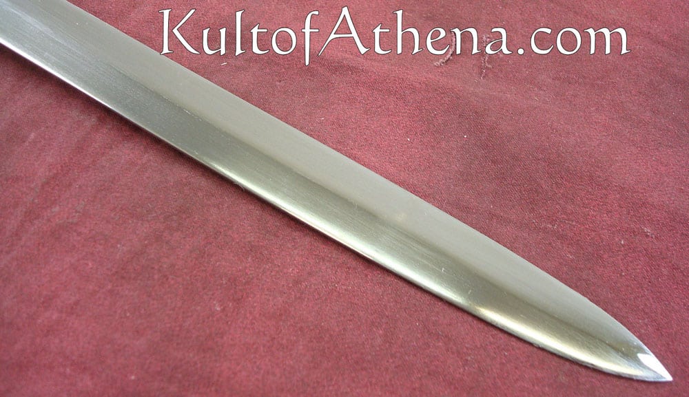 Firstly, this sword is not near the specs KuA advertises, or for that matter many other companies both in the U.S. and in EU that offer it. It is advertised by KuA as 1lb. 13.3oz (830 g) and by other sites as 883g (1lb 15oz); it is in fact 2.07lbs, or 940g. The blade is exactly 31″ in length and 10% thicker at the hilt than advertised (7.75mm vs. 7mm). Its POB is 6″, so the heavier blade does not compromise handling per se, even though the grip diameter foils optimum control. The grip is rather too small in diameter to allow good control of the piece, but thus may reflect the actual shortcoming of the original historical design. It does have more of a distal taper than most Universal offerings, but there is not as pronounced a blade taper to the tip as the actual historical sword, causing it to feel more tip-heavy than I expected. As delivered, the sword would not fully seat into the scabbard, leaving an inch of blade exposed, so filing must be done to both the scabbard throat and the blade.