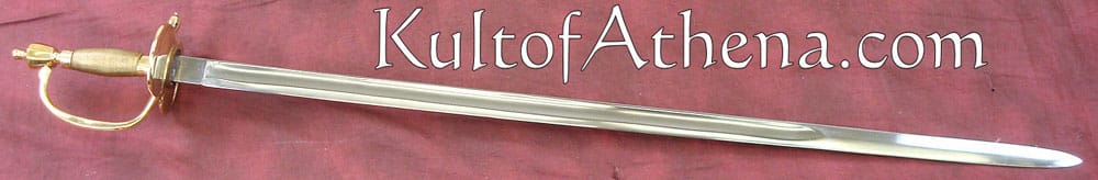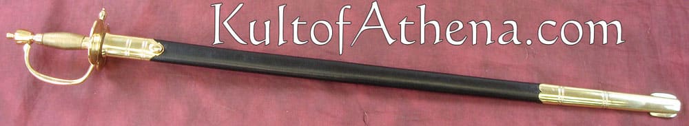 This recreation of the British 1796 Sergeants sword has a plain blade of unsharpened, tempered, high carbon steel. The hilt is entirely of brass. The scabbard is of leather with brass accents. The sword is the longer version used by the sergeants instead of the shorter blade used by the musicians, though the overall sword design and construction were inherently the same.