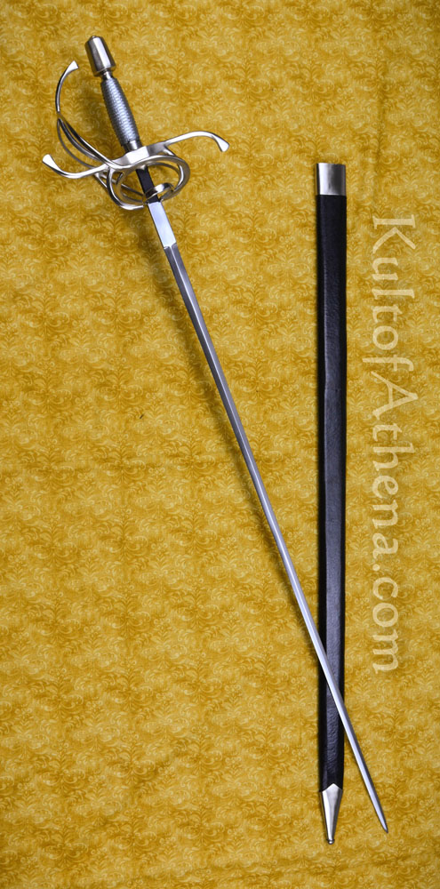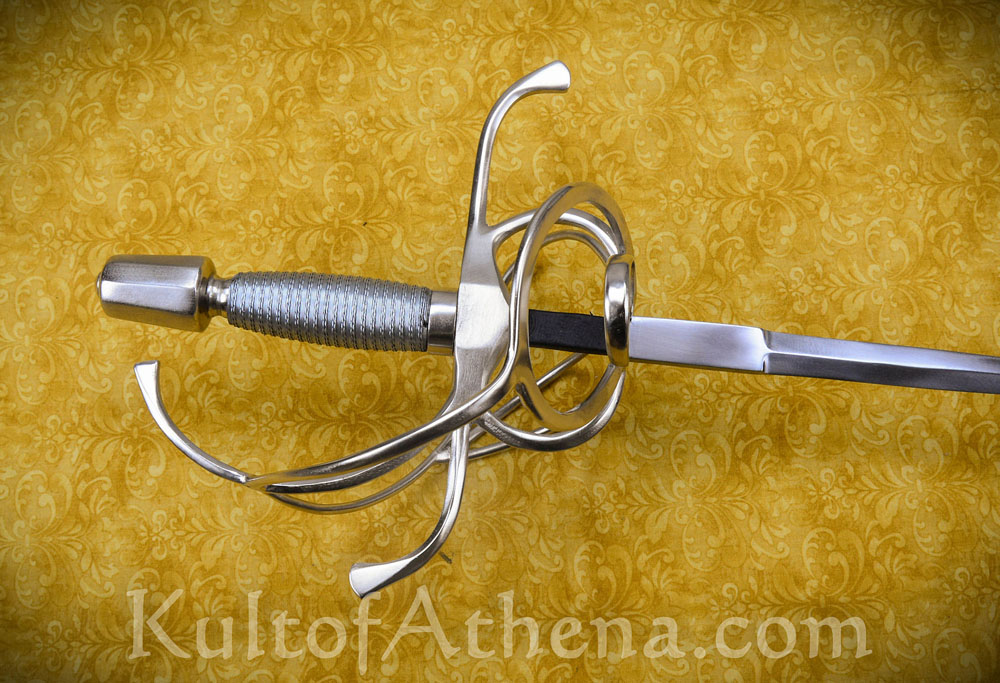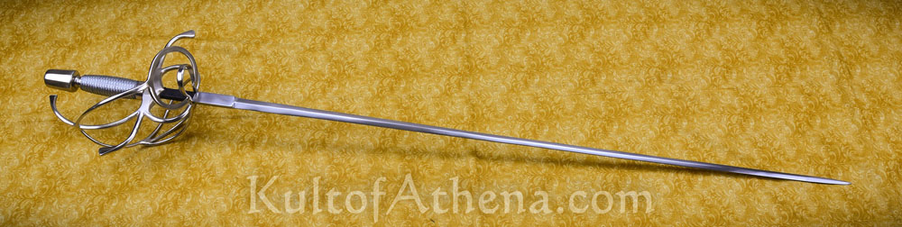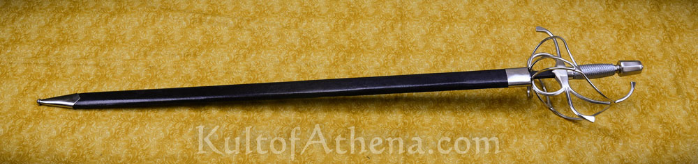 This 17th Century Swept Hilt Rapier has a slender thrusting blade forged from EN45 high carbon steel; the diamond cross section of the blade imparts some stiffness to the blade to ensure it can pierce with maximum effect. The swept hilt is crafted from mild steel and the grip is wood which has been tightly bound in steel wire. The base of the blade is overlaid in black leather for an improved grip when using the finger guards above the crossguard.