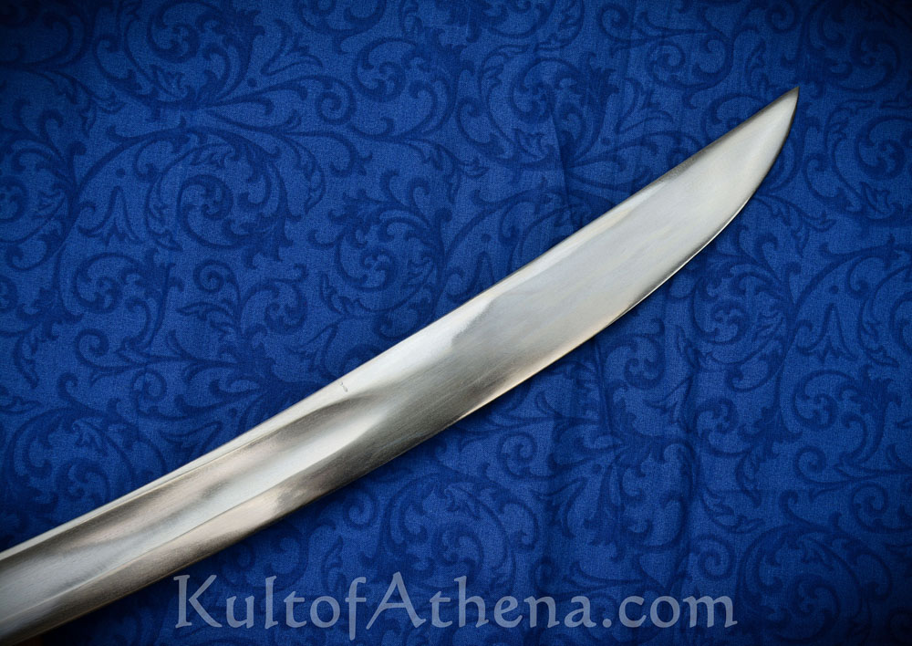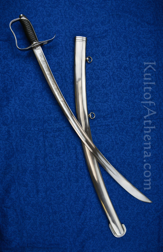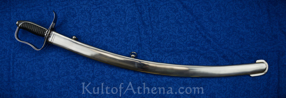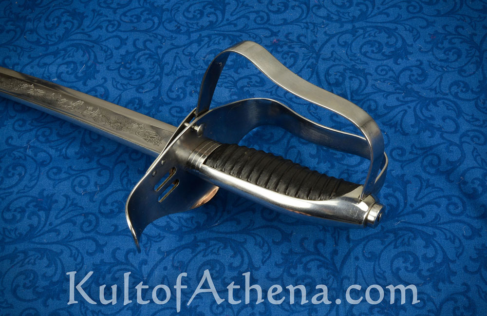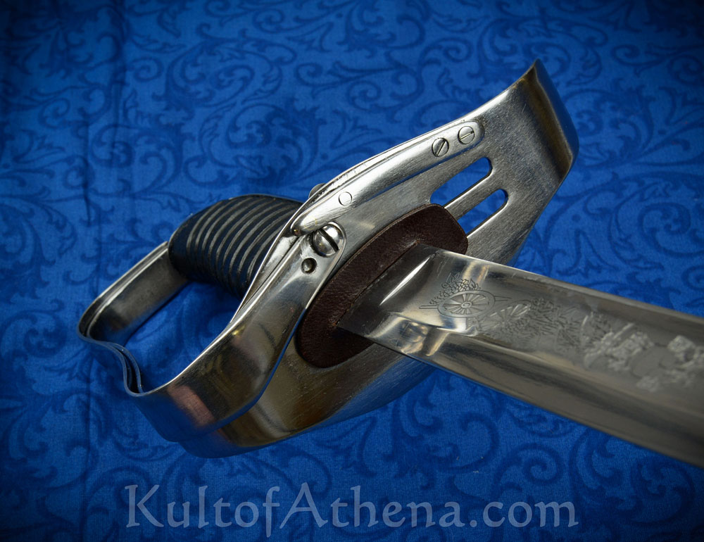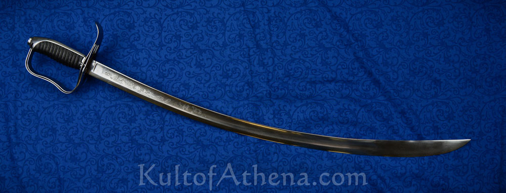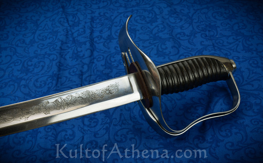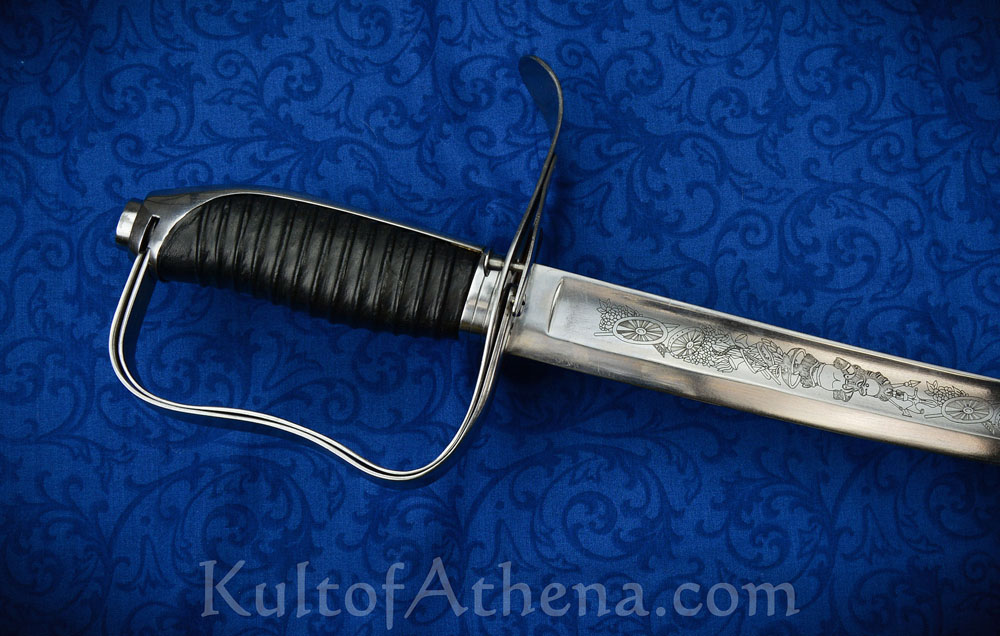 This Hungarian 1827 Officers Saber has a blade forged from 1055 high carbon steel and etched on both sides of the blade with period Neoclassical iconography. The hilt is steel and the wooden grip is bound in black leather. Unique to this saber is the modifiable hilt – the mechanism on the guard allows for the articulated second bar to move from a position that is flush with the main knuckle bow to a position that is nearly 90 degrees perpendicular. This rare modifiable hilt allows for the sword to be worn comfortably and unobtrusively when at rest, but when the time comes for action a simple pull on the bar and a spring lock on the guard greatly enhance the protection offered by the hilt.