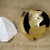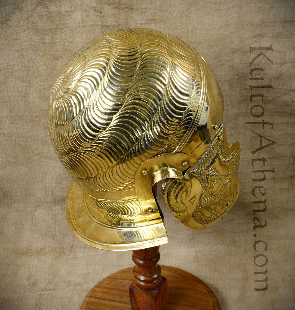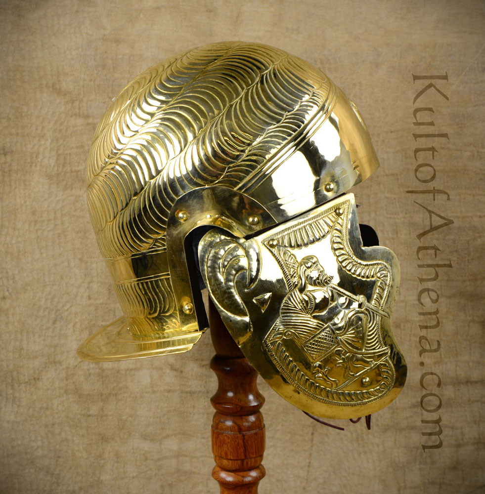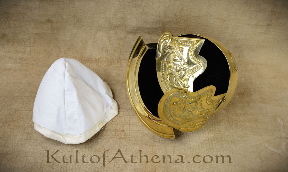 This 1st Century Roman Auxiliary Cavalryman's helm is imbued with richly embossed detailing and is crafted from 20 gauge brass. The cheek-plates are riveted to working leather hinges and the interior is blackened. Included is a basic arming cap of cotton.
