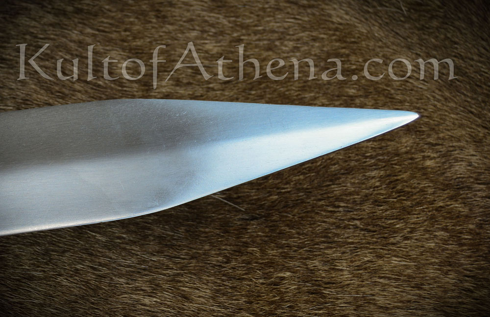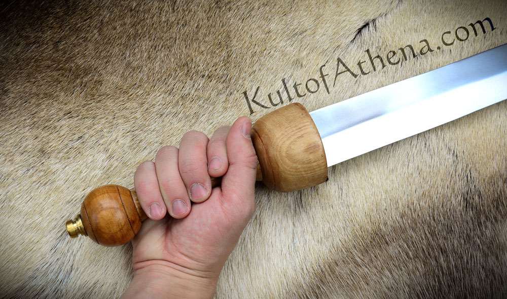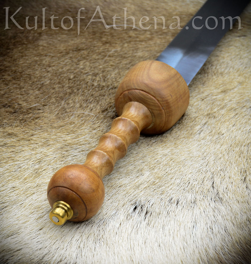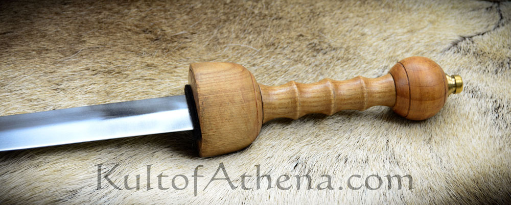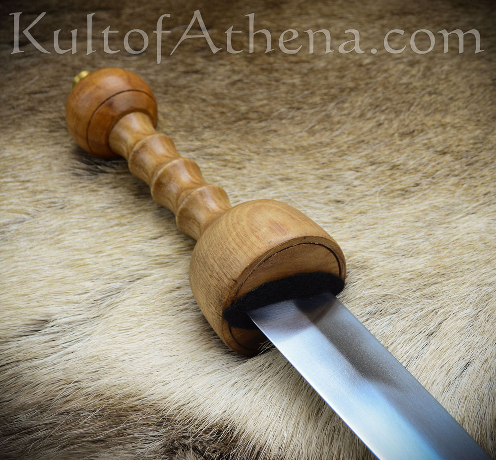 This 1st Century Roman sword is based on an example kept within the collection of the Aalen Museum in Germany. The straight, Pompeii-style blade terminates in an acutely-tapered stabbing tip and is forged from high carbon steel. The entirety of the hilt is skillfully carved from polished wood and the pommel is capped with a brass pommel nut. A felt tab is fitted at the base of the blade atop the guard to protect it from scratches and indentations from contact with the scabbard – it can be removed if desired