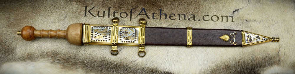 The scabbard has a core of wood and is overlaid in brown-dyed leather and bound within brass accents; iconographic, decorative plates of steel and brass are fitted onto a single side of the scabbard. The scabbard is finished with two sets of hanging rings with which to fit the sword to a Roman-style baldric.