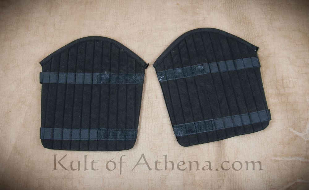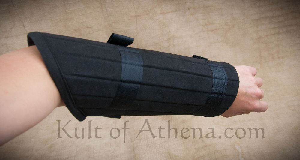 This pair of forearm protectors for HEMA sparring are crafted from nylon and suede leather with ribbed inserts of protective plastic sewn within. The armor is fitted to the arm with velcro straps.