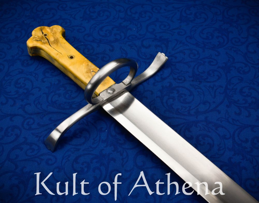 This Beham style Messer by specialist swordsmith Ádám Bodorics is a wonderfully agile sword in the hand that strikes with velocity and power – its wide and well-tempered blade bites deeply and its thin profile along the main cutting portion of the blade passes through a target with little drag and resistance – a truly fierce performer in a scrap of a melee! The thick ring at the hilt gives impressive protection to the entire hand from even notably larger weapons and the grip is a unique composite with the thick tang riveted and embedded between two halves of smoothly polished boxwood which is framed in strips of finely worked brass. The wood grip halves may look cracked, but they are actually created from a deliberate reconstruction of smaller pieces with strong and colored bonding filler in order to give the grip a unique theme and appearance that is perfectly apt to the troubled times of early 16th century Germany.