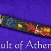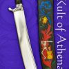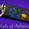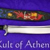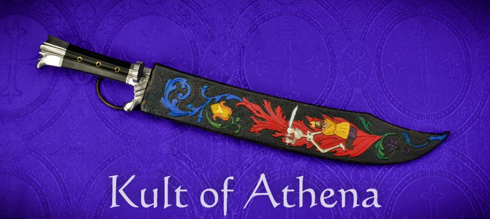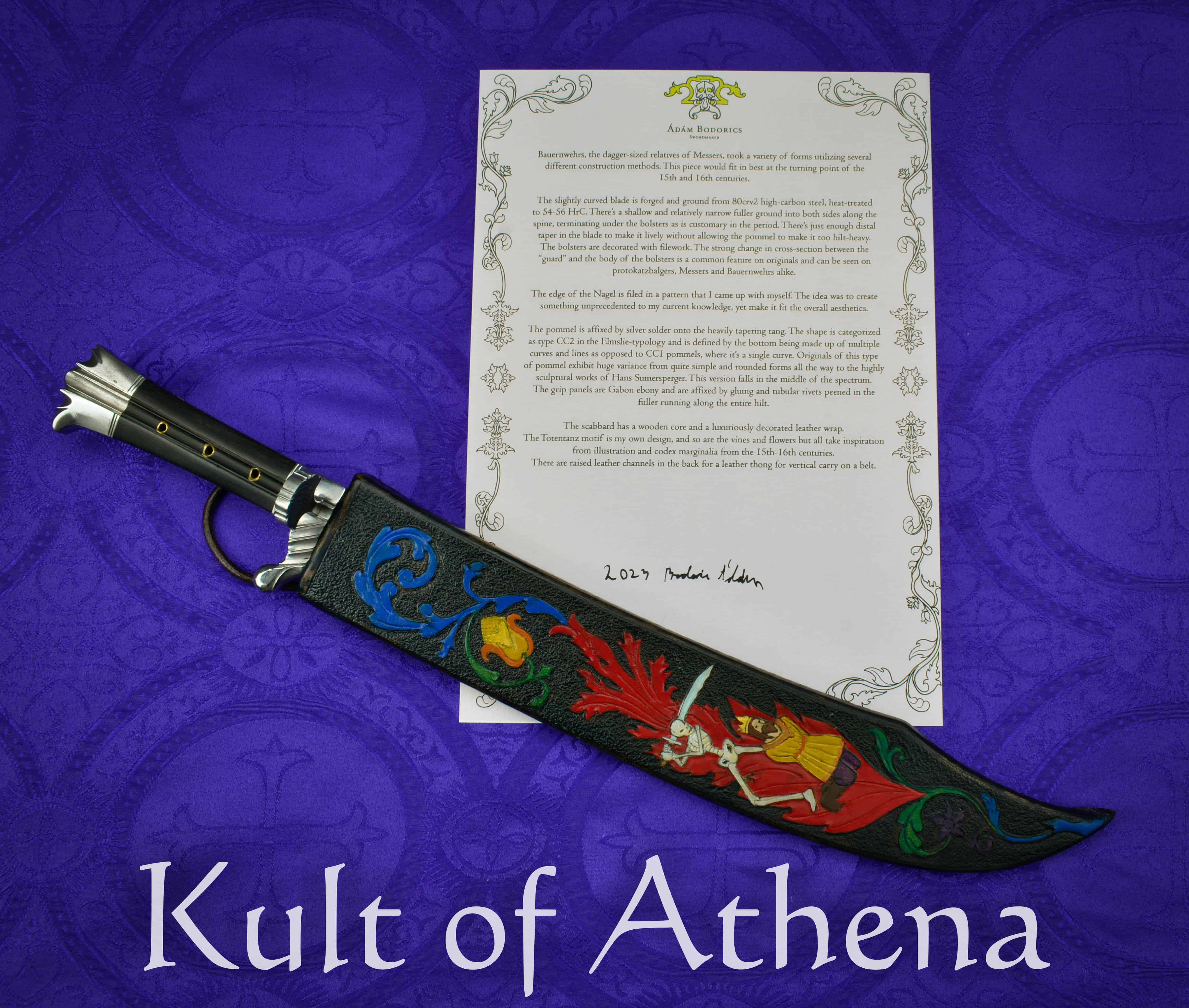 This custom crafted Bauernwehr by specialist bladesmith Ádám Bodorics matches an elegant, but powerful-striking Bauernwehr fighting dagger with a marvelously crafted scabbard with hand tooled and handpainted Totentanz motif. The thick-spined dagger is quite robust and rigid and is well-tempered and sharpened and comes with plenty of mass to power it decisively through its target and a clipped tip point gives it impressive puncture ability as well. The grip has a bolster, pommel and nagel of steel and two grip halves of finely carved and smoothed ebony which are riveted directly to the thick blade tang which is tapered for improved overall balance. The included wood-core scabbard is bound in wood and meticulously hand tooled to create a complete package that is a fine custom piece to complete your Landsknecht kit. A certificate of authenticity is included and signed by Ádám. Below are Ádám’s own thoughts on his custom creation: