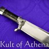 Bauernwehrs, the dagger-sized relatives of Messers, took a variety of forms utilizing several different construction methods. This piece would fit in best at the turning point of the 15th and 16th centuries. The slightly curved blade is forged and ground from 80crv2 high-carbon steel, heat-treated to 54-56 HrC. There’s a shallow and relatively narrow fuller ground into both sides along the spine, terminating under the bolsters as is customary in the period. There’s just enough distal taper in the blade to make it lively without allowing the pommel to make it too hilt-heavy. The bolsters are decorated with filework. The strong change in cross-section between the “guard” and the body of the bolsters is a common feature on originals and can be seen on protokatzbalgers, Messers and Bauernwehrs alike.