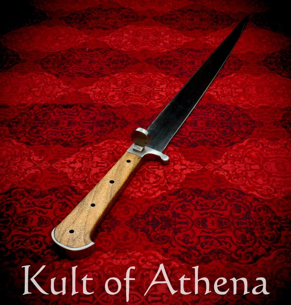 It certainly has an authoritative heft in the hand, but still feels agile and capable and its elongated grip is intended to give the entire weapon a favorable balance that feels agile in the hand. This short sword could easily penetrate thick clothing and split mail rings and its thick, stiff blade with reinforced tip and is a ready lever for rending apart the weaker points in an armored defense. Its nagel gives it defense for the hand and some parrying / bind ability and the hand feels comfortably seated in the contoured grip.