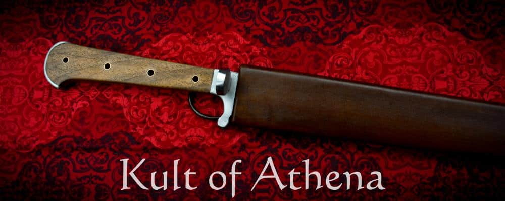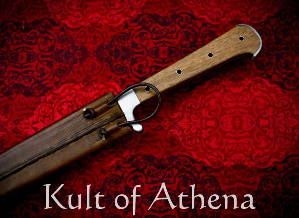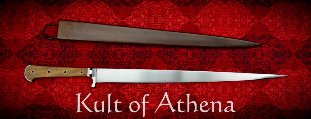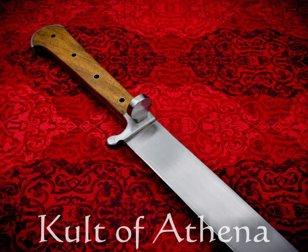 The blade is crafted of well tempered 6150 high carbon steel which has a final tempered HRc hardness of 52-54 HRc. The grip is a composite of steel and brass-riveted walnut all stoutly riveted to a very thick tang. A robust peen over the pommel gives the hilt an altogether rock solid construction. Included with the sword is a handcrafted wood-core scabbard of birch plywood which is bound in stitched and form-fitted leather and completed with a hanging belt loop.
