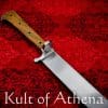 The blade is crafted of well tempered 6150 high carbon steel which has a final tempered HRc hardness of 52-54 HRc. The grip is a composite of steel and brass-riveted walnut all stoutly riveted to a very thick tang. A robust peen over the pommel gives the hilt an altogether rock solid construction. Included with the sword is a handcrafted wood-core scabbard of birch plywood which is bound in stitched and form-fitted leather and completed with a hanging belt loop.