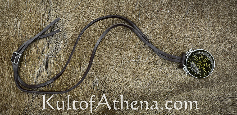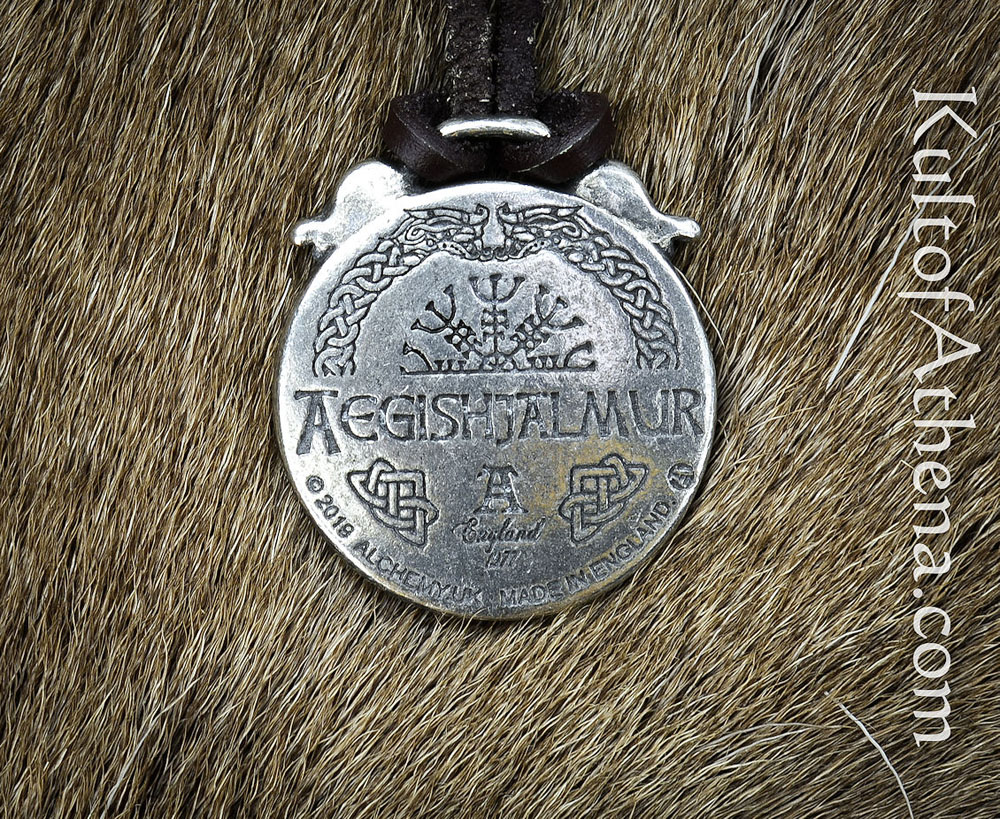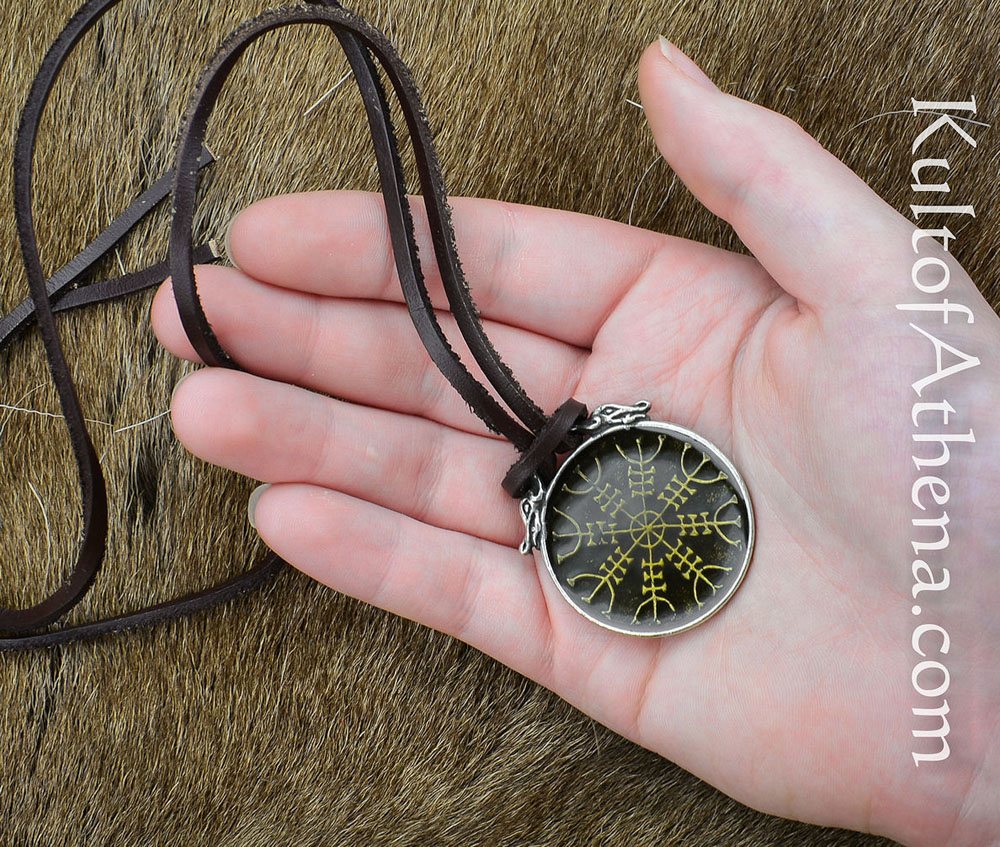 Cast in intricate pewter, this Norse Aegishjalmur stave run is set within an enamel of a smoky amber. It leather cord is laced through twin dragon heads and its reverse features elaborate knotwork inscription.