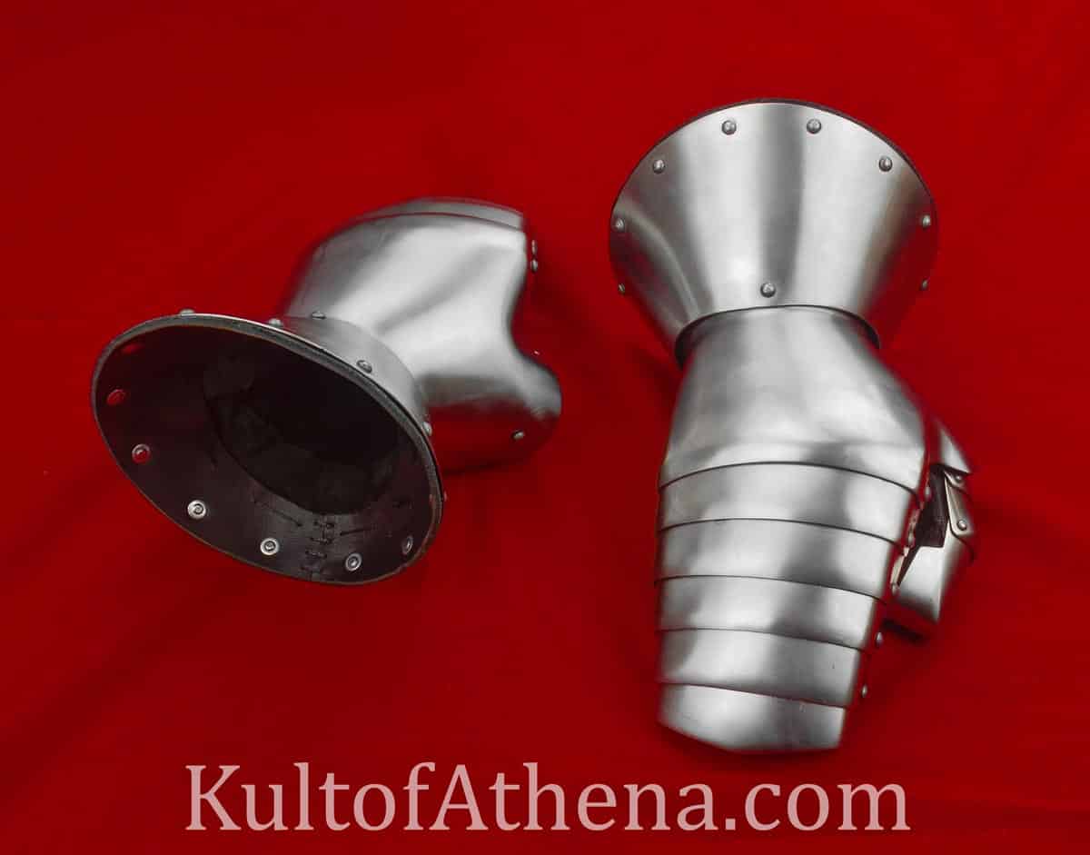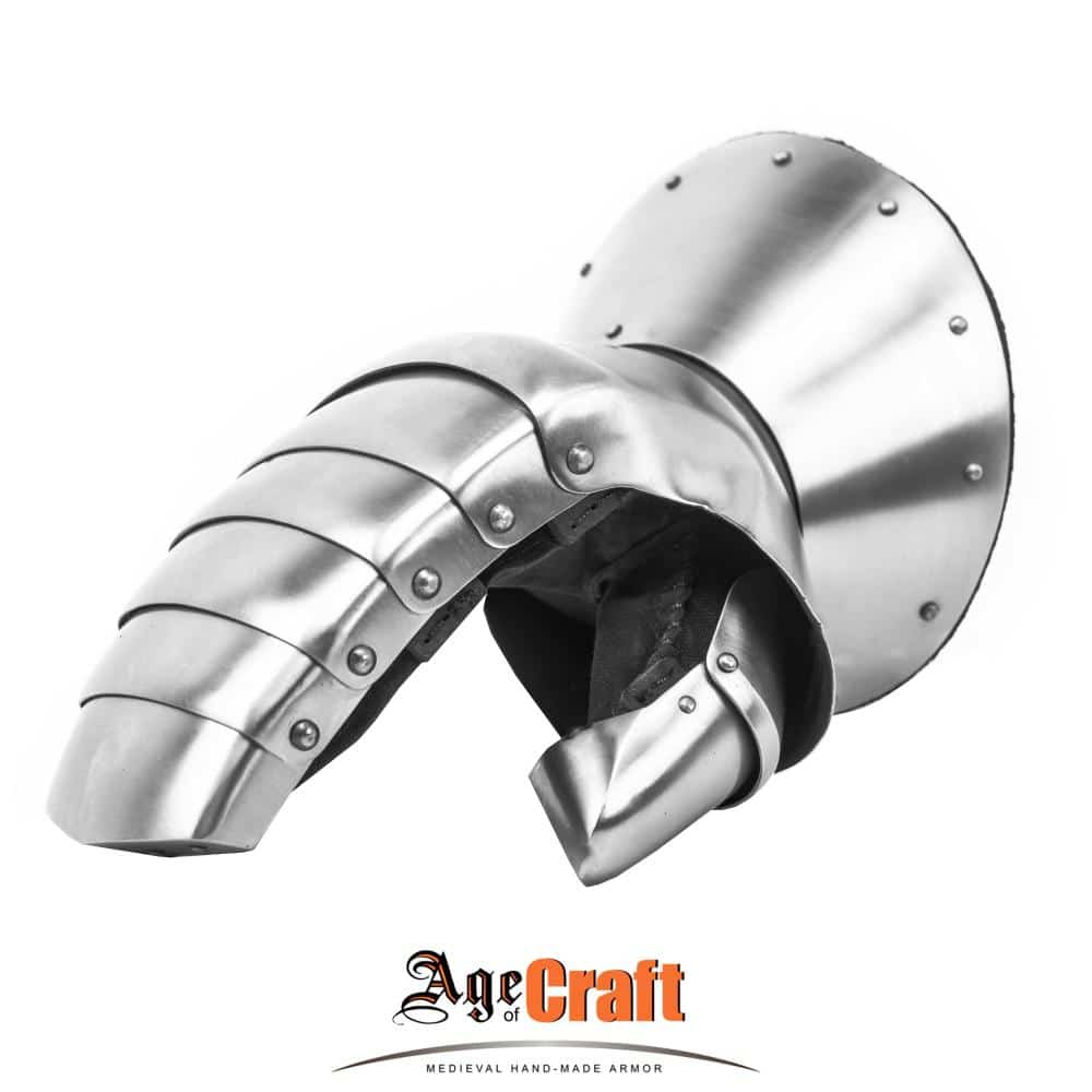 These robustly crafted gauntlets are crafted from tough and well-tempered 18 to 19 gauge steel and are fantastically well articulated for optimal hand movement; they are ideal for hard-hitting HMB sport fighting and other medieval combat sports. The 15th century design of these gauntlets are taken from a pair depicted on a medieval German statue in Nuremberg and this segmented clamshell design was both an advanced and highly protective design for its time. This version from Age of Craft improves on this with additional plate protection that goes around the tip of the thumb for notably improved protection