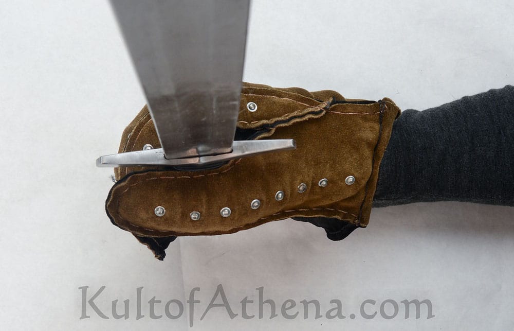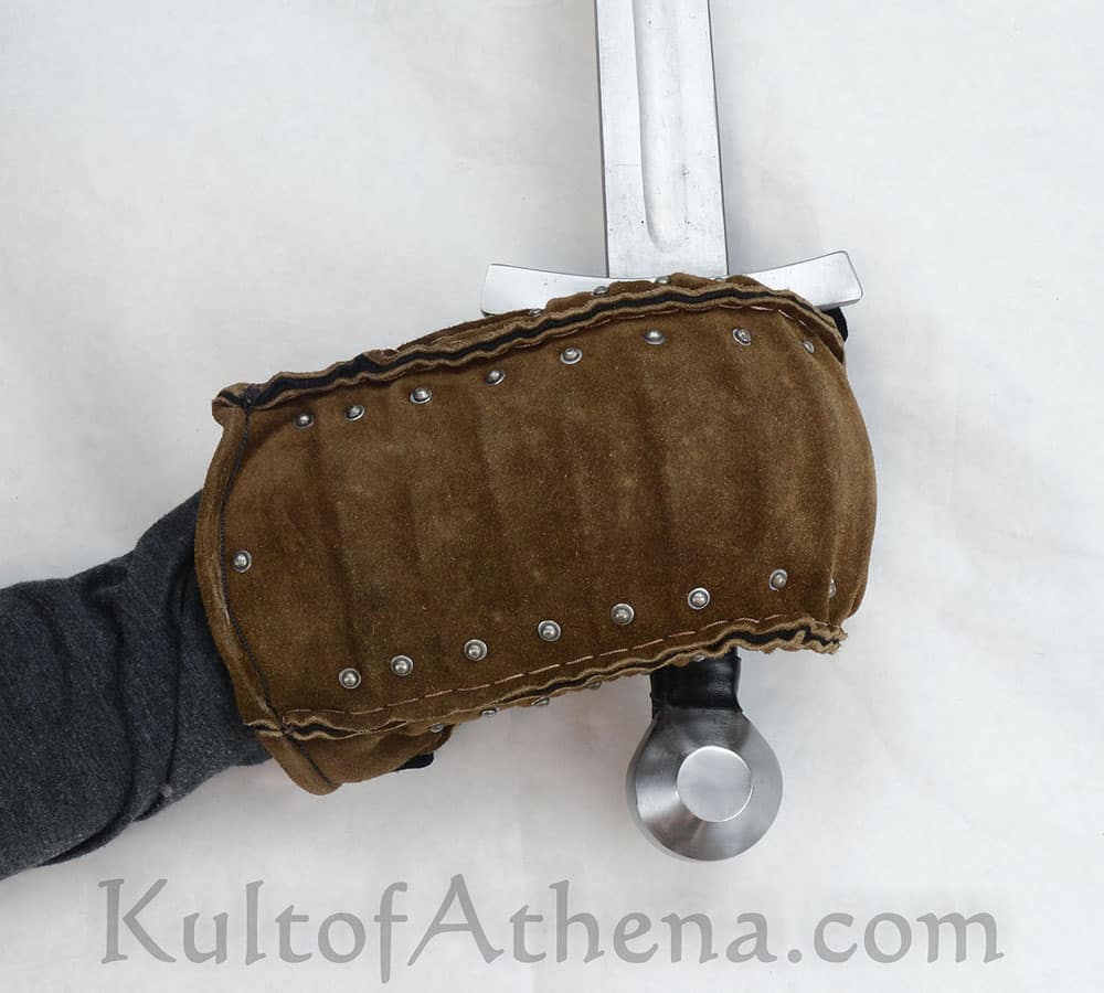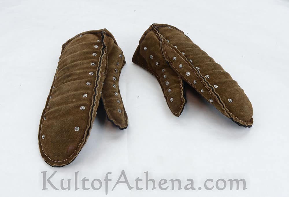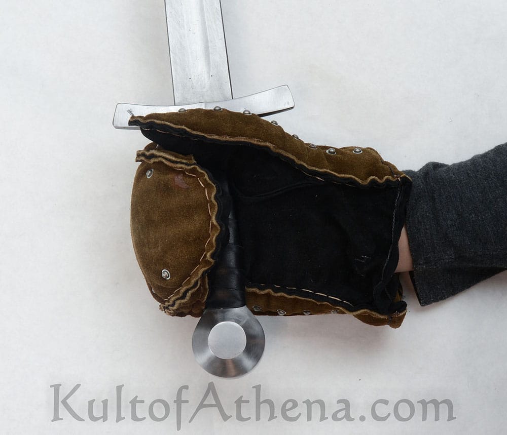 These highly protective brigandine mittens are built for Historical Medieval Battles (HMB) sport combat and feature articulated plates of tempered 0.8 mm spring steel riveted between a shell of high quality suede leather which is reinforced with stitched edging. Internal padding within the mittens gives excellent impact protection. Well articulated, protective and ready for combat these armored mittens are in a form typical of the 13th century medieval knight.