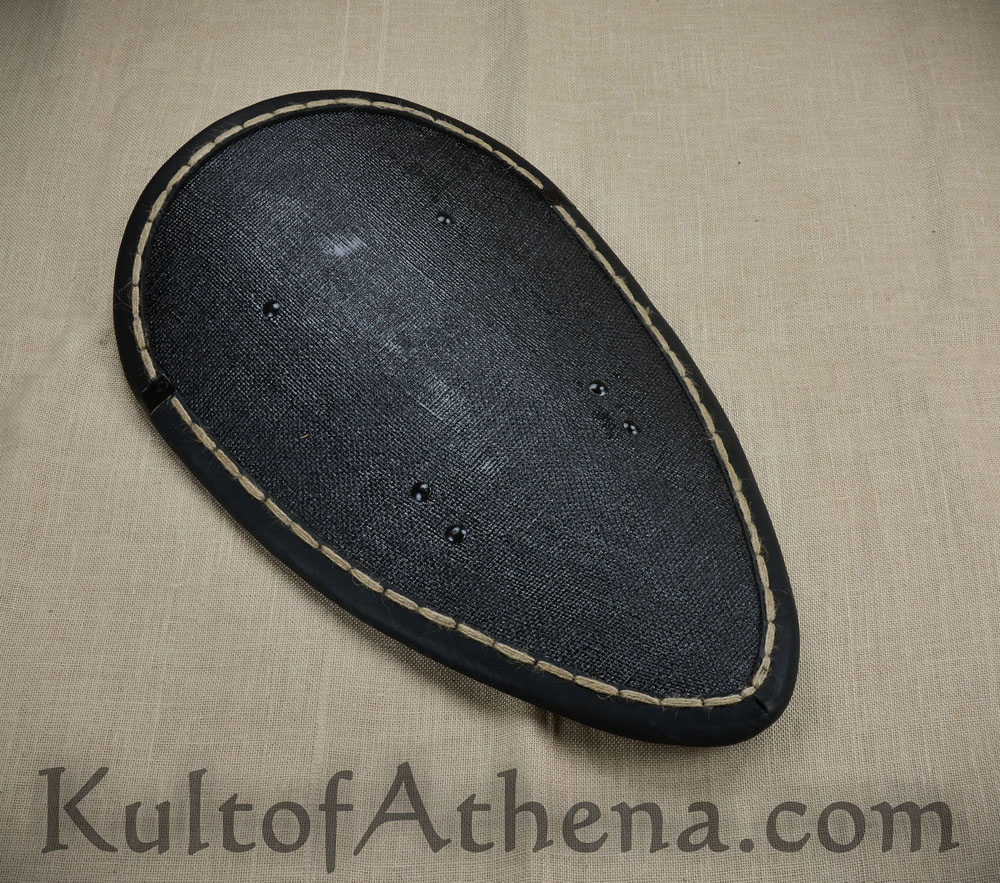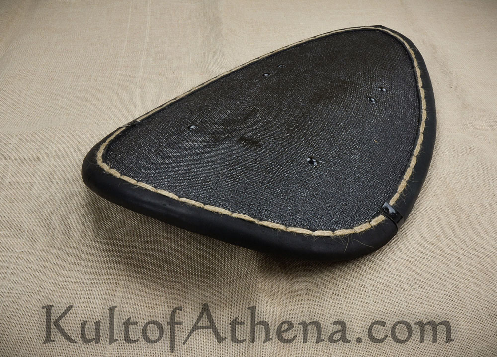This heavy duty shield is built for hard-hitting HMB sport combat; this shield from Age of Craft is an excellent choice when a truly stout and long-lasting shield is needed for heavy combat. It is made from thick wood and its rounded edges are rimmed in thick leather which is secured with substantial cord stitching. The face of the shield is bound with a thick textile before being painted.