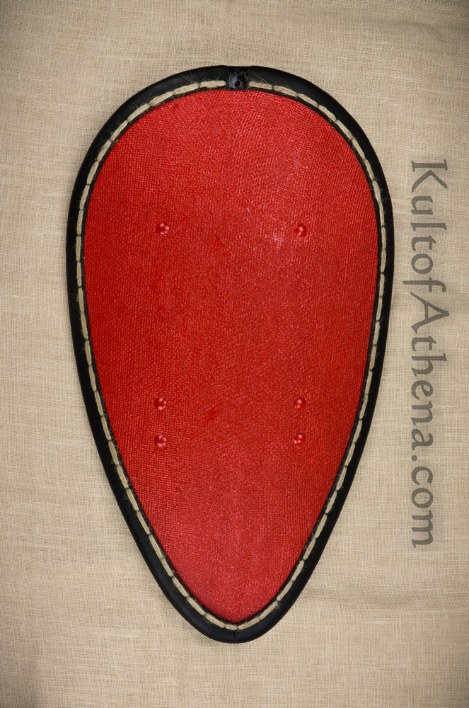 The back of the shield has a padded arm panel and a set of straps to secure it to the arm; a steel buckled strap for the forearm and a pair of thick crossed leather straps give a secure handhold for the palm to complete the shield for battle.