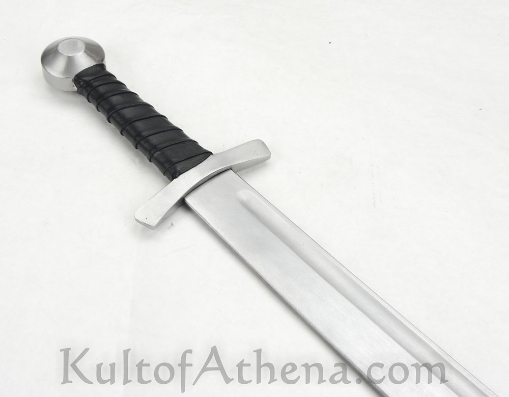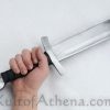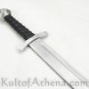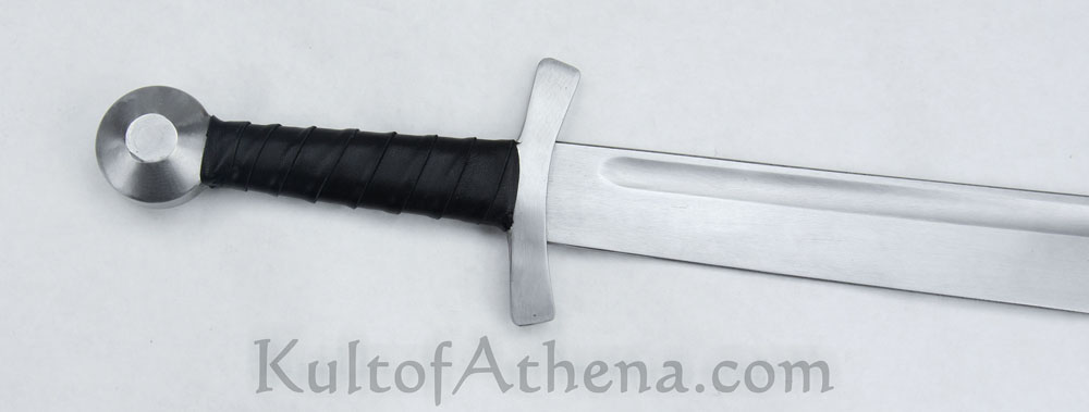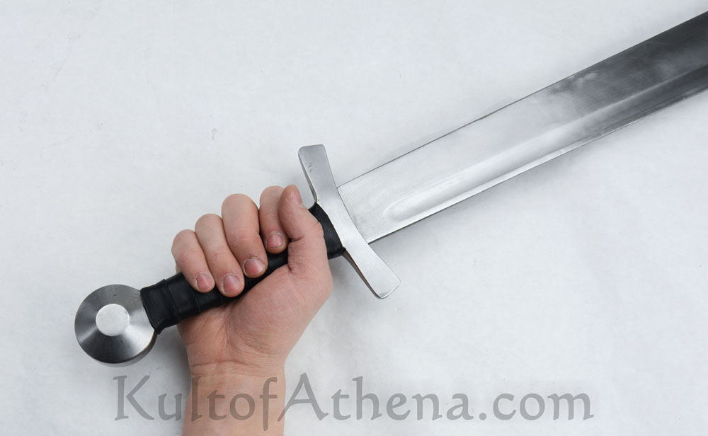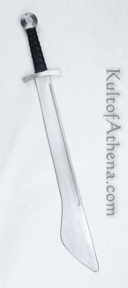 This Falchion from Age of Craft is a robustly built weapon designed for the rigors of full-contact HMB / Buhurt Sport Combat. The blade is thick G65 spring steel with blunted edges that are at approximately 3 mm+ in thickness throughout. The crossguard and pommel are steel and they are welded to the tang for an durable overall construction. The grip is finished with a wrap of spiralled leather.