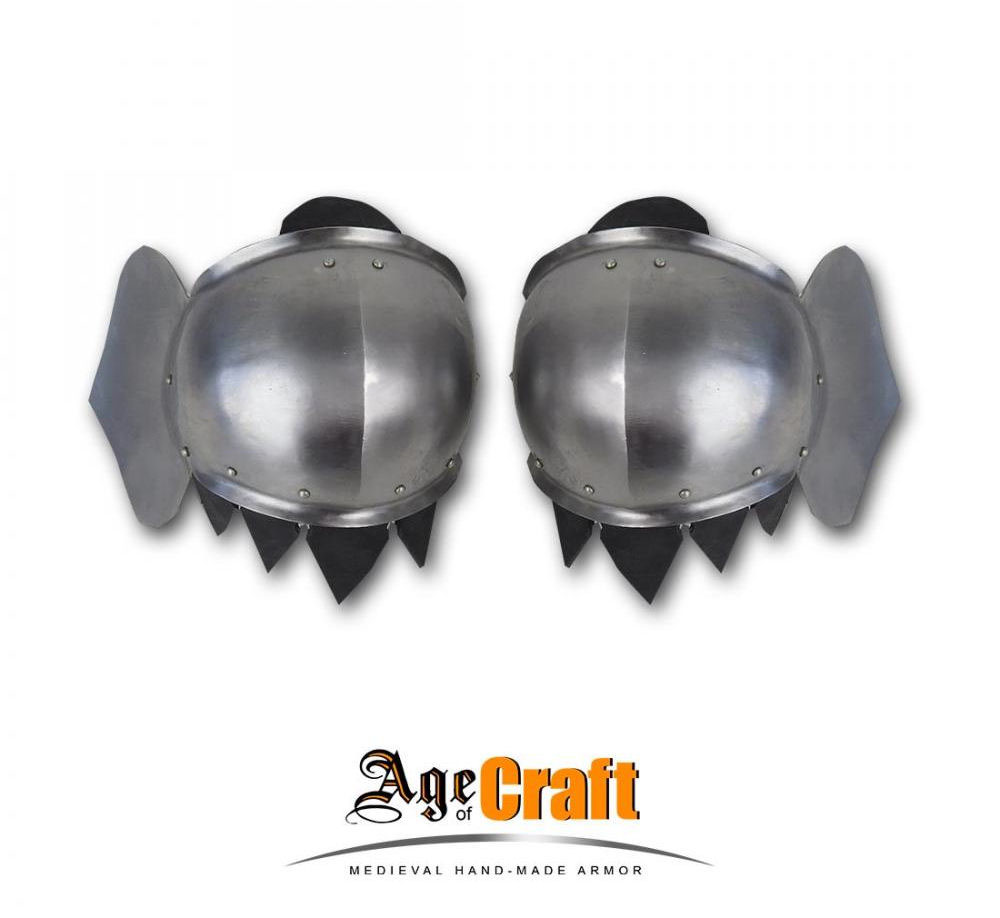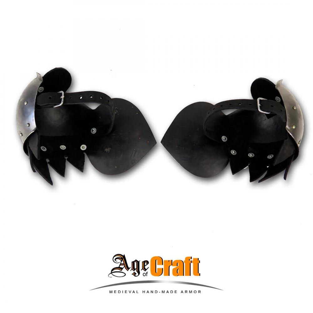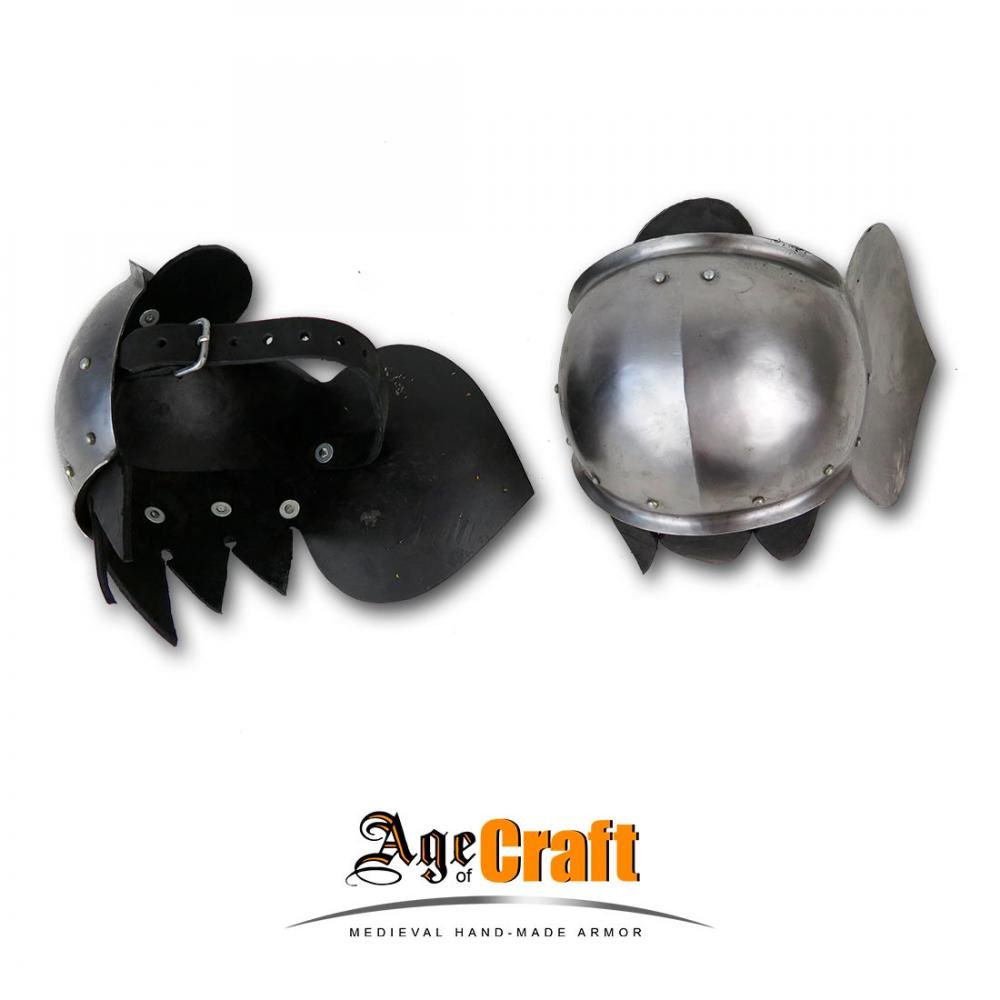 These tough poleyns are built for hard-hitting HMB sport combat and are made from 18 gauge tempered spring steel; the edges of the poleyn are lined with thick, riveted leather to protect your leg and armor from the plate edges. A dual set of thick leather straps affix this knee armor to the leg. These poleyns are of a late medieval design and well suited to a 14th -15th century fighting kit.