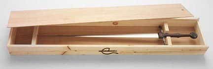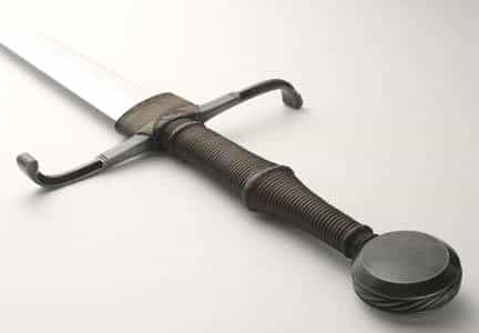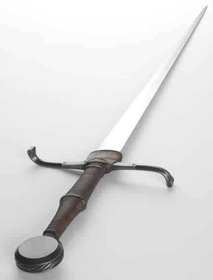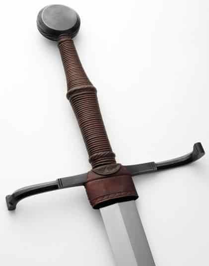 Albions recreation of this sword has a blade that has been hand ground to shape and tempered for the right mix of flexibility and edge retention and finished to a satin polish. The crossguard and pommel are of blued steel and the grip is wood covered with tight leather over cord. A leather chappe rainguard is fitted over the center of the crossguard.