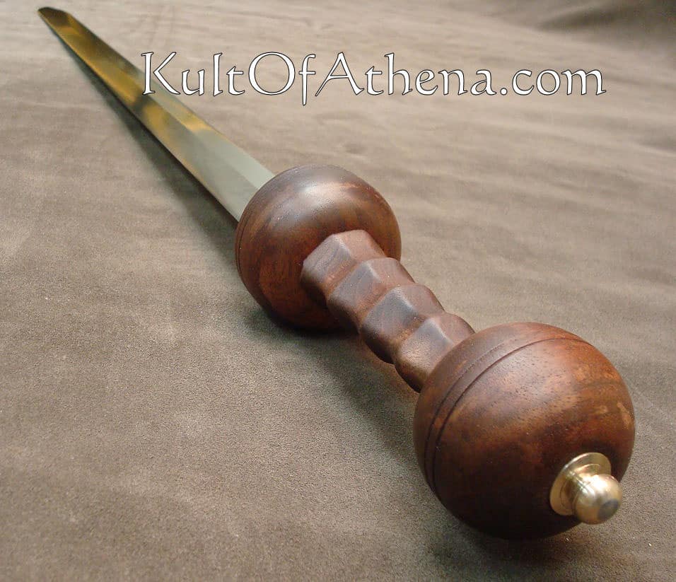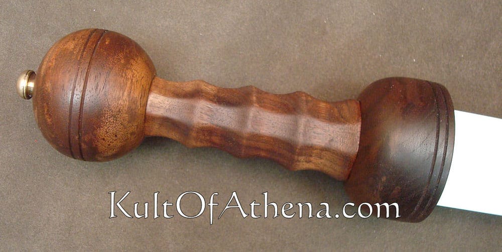 The Albion Auxilia has a comfortable heft that balances liveliness with hitting power. Overall weight is low and the distribution of mass results in a soft forward pull that helps direct the edge during a cut. It is easy to understand why swords such as these were essential weapons for the Roman cavalry man. The hilt is an all wood construction, with a reinforcing guard plate of bronze inleted into the forward end of the guard, and a mushroom shaped rivet block. The guard and pommel are hand turned after the example of surviving specimens. The grip has an eight sided cross section with finger groves that provides a firm purchase and a clear indication of the direction of the edge. The seemingly simple shape of roman sword hilts is an ingenious design, where the components and their form are reduced to the essential minimum, while expressing a stark elegance. The walnut wood hilt is given a 24 hr soak in linseed oil, left to harden over 48 hours and then polished on a cloth wheel. This treatment helps to seal the wood against moisture and gives a soft satin sheen that deepens the natural colors. The blade is made of high carbon steel with a diamond cross section and fully sharpened edges.