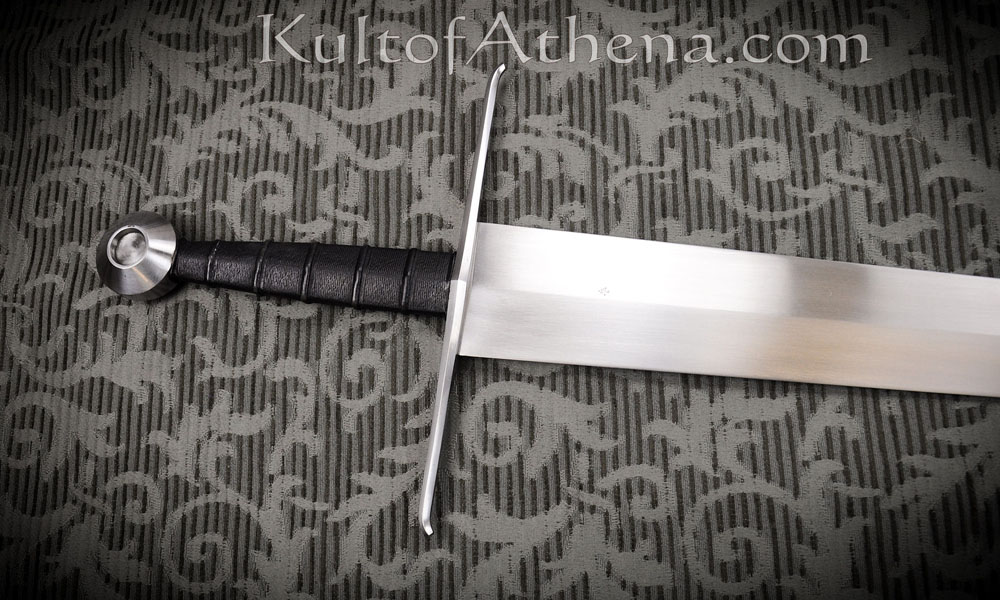 This recreation, by Albion Armorers, has a hand ground and sharpened blade of high carbon steel. The crossguard and pommel are cast from mild steel. The grip is of stabilized birch wood, cord-wrapped and fitted over with tight leather.