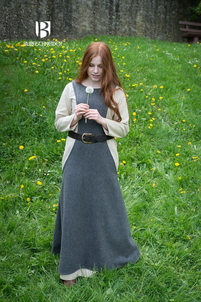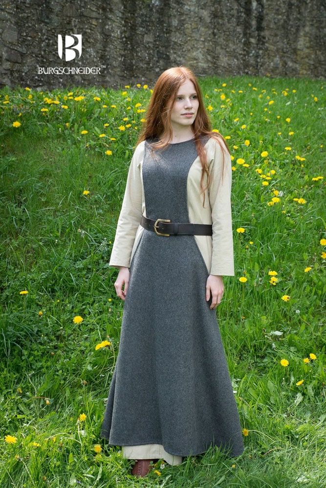 This Medieval Sideless Surcoat Dress is crafted from blended wool fabric and is meant to be worn over an underdress for a complete Medieval outfit. Surcoat dresses began to be worn by women in the 13th century and their exposure of the hips of the underdress was considered risqufor the times. A common and iconic fashion of the High Middle Ages, they would be worn well into the 16th century Renaissance, though typically worn only in the most formal of settings by that late period.
