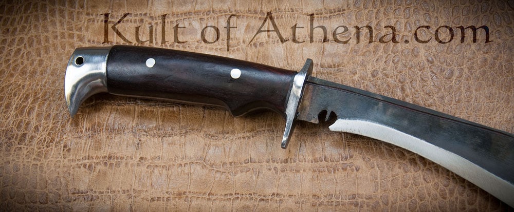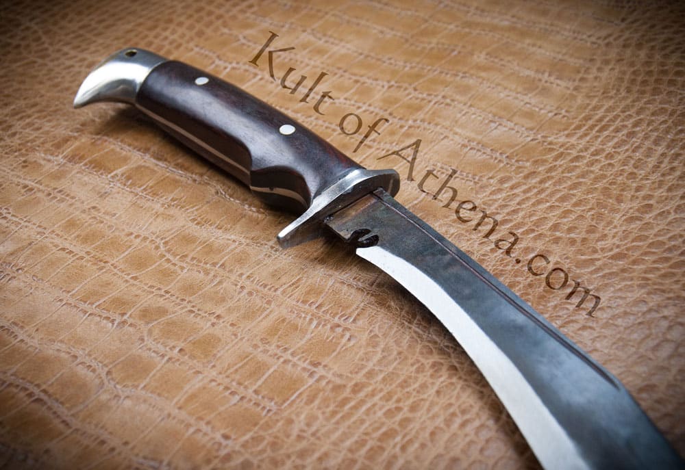 This Sirupate Khukuri has a blade of 5160 high carbon steel. the body of the blade was left rough-polished – a move that helps much of the blade resist rust. The blade was differentially tempered to give it a hard, dull-resistant edge and a softer mid-section and spine to give the blade some shock absorption to ensure that the blade as a whole is not brittle. The pommel and bolster are of steel and the grip is made from two carved halves of rosewood stoutly riveted to the full tang.