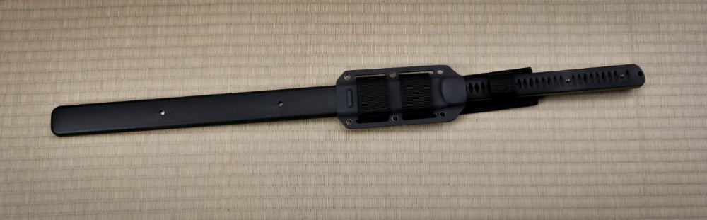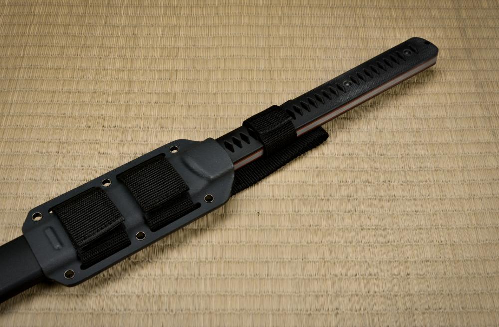 The pierced black canvas Micarta handle provides exceptional comfort and a secure grip, with smooth blade spines and liners for seamless handling. The accompanying scabbard features a Molle-compatible Kydex locket platform with a fiberglass shaft, ensuring secure and adaptable carry options. The overlapping sheath designs allow the Fallout Series tools to be paired like a traditional daisho, offering flexible combinations for users.
