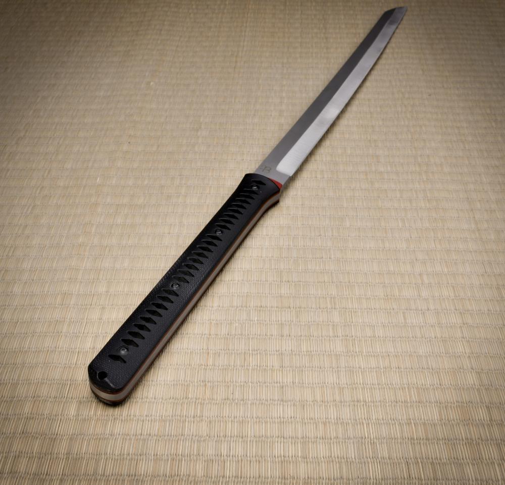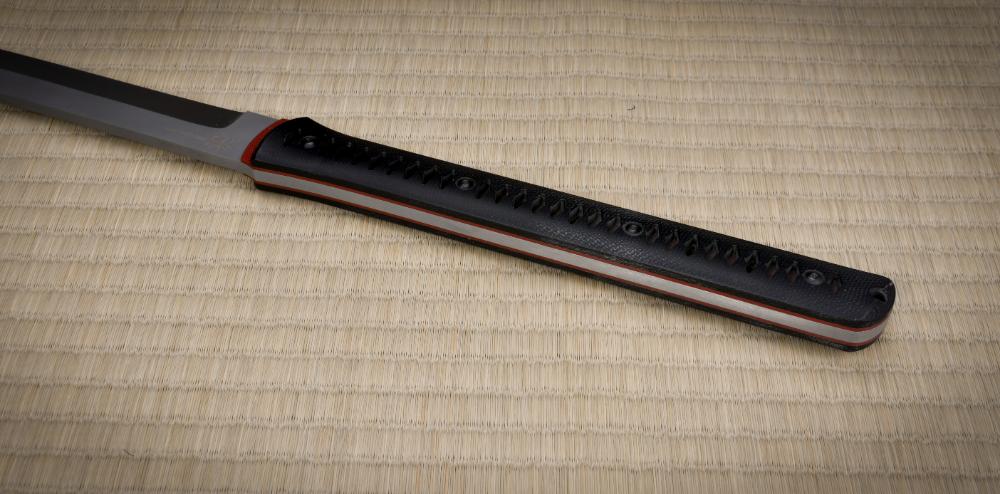 The Fallout Series features blades forged from D2 and 1075 steel, finished in a striking two-tone design which is tempered to hardness of 50 HRc at the edge and 42 HRc at the spine. The full-tang construction, paired with pierced black canvas Micarta handle scales and vibrant APOC Red G10 liners, ensures a superior, comfortable grip. The handle design echoes the traditional tsuka-ito of a katana, while the textured red G10 liners mimic dyed same (rayskin), merging cultural elegance with modern utility.
