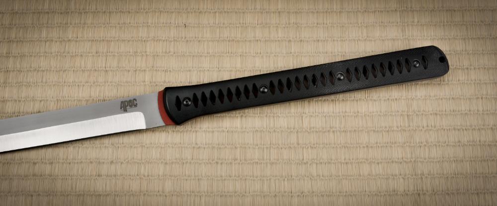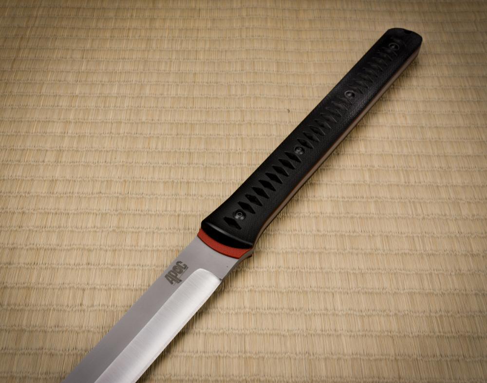 The Fallout Series features blades forged from D2 and 1075 steel, finished in a striking two-tone design which is tempered to hardness of 50 HRc at the edge and 42 HRc at the spine. The full-tang construction, paired with pierced black canvas Micarta handle scales and vibrant APOC Red G10 liners, ensures a superior, comfortable grip. The handle design echoes the traditional tsuka-ito of a katana, while the textured red G10 liners mimic dyed same (rayskin), merging cultural elegance with modern utility.