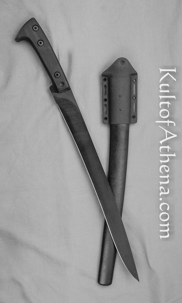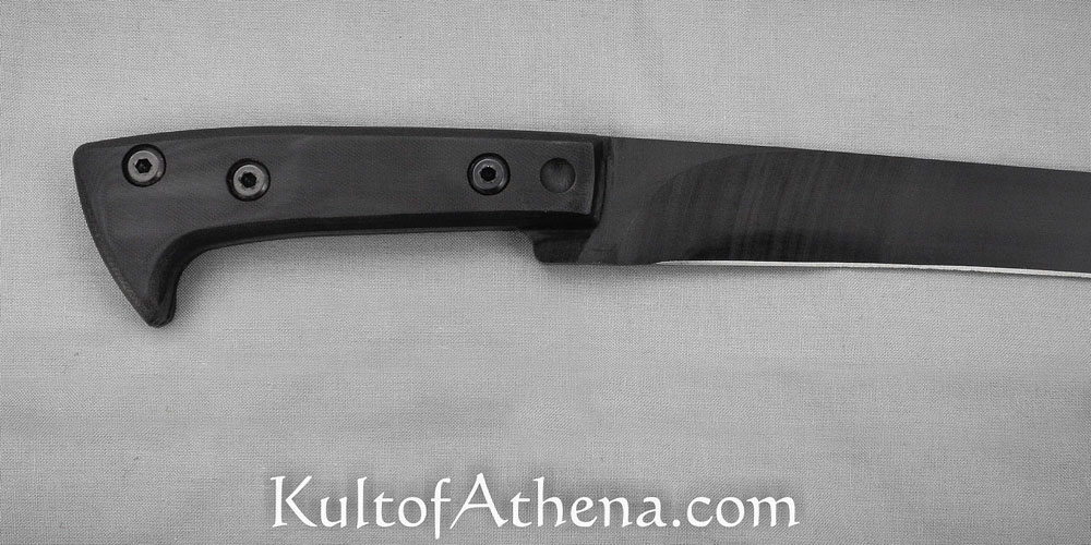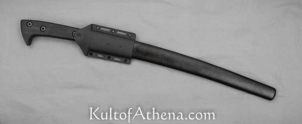 Great cutter, and even chops deep into wood. The only thing I don’t like about this is that the design (just about every yataghan ever made in hundreds of years of use) doesn’t have a way to keep the hand from sliding forward if you stab and hit something hard. It’s a slasher/cutter/chopper and not a stabbing blade, but in a zombie invasion you just might have to stab the head!
