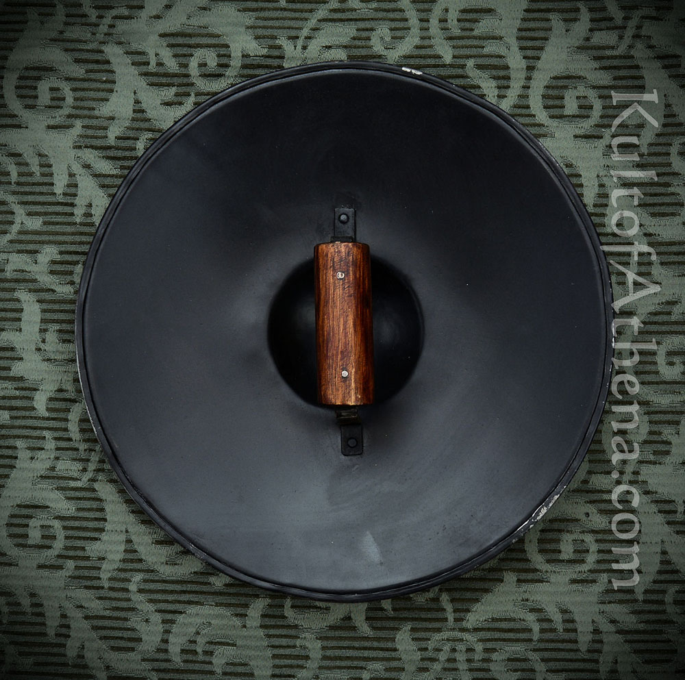 The reverse of the buckler is blackened and the riveted steel grip is fitted with two halves of rounded wood to finish the grip.