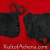 This pair of leather gauntlets are ideally suited for an archer; the left gauntlet has an integrated tab to give padded protection to the palm of the hand and the seamless design between the hand and arm protection gives no gap for an errant bowstring to strike the wrist. The gloves are crafted from supple and high quality black leather and are widely adjustable to size with their leather cord lacings which lace through sturdy eyelets of black metal.