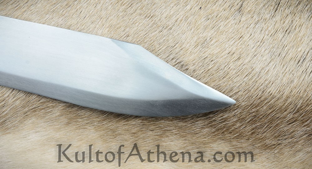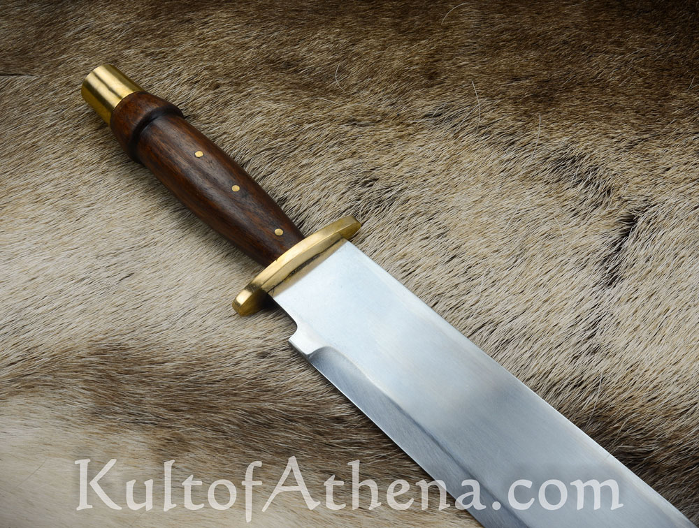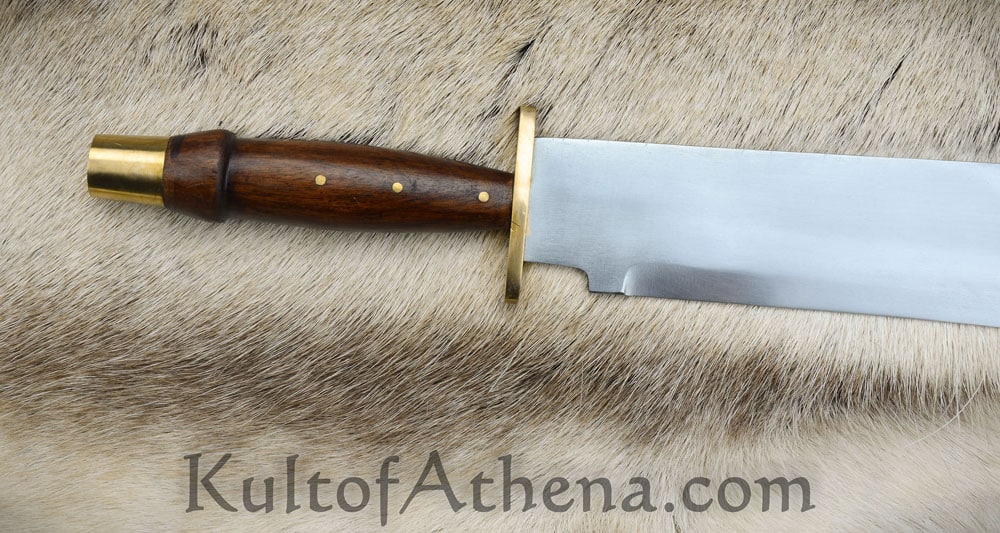The Arkansas Bowie Knife has a large blade of high carbon steel with a thick and strong base and spine and a tapered thrusting point. The blade is mounted into a handle with a guard and end cap of brass and a carved grip of wood. The blade tang is triple-riveted with brass for a secure construction.