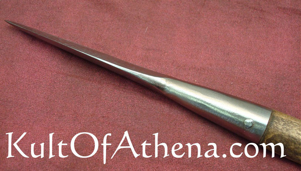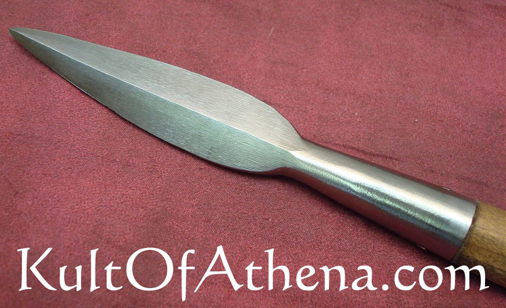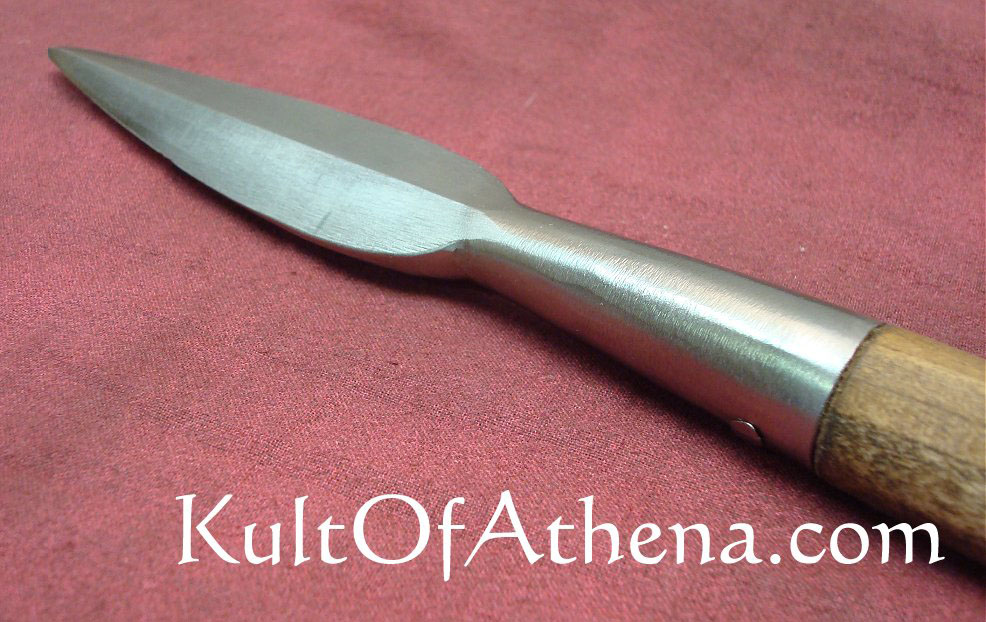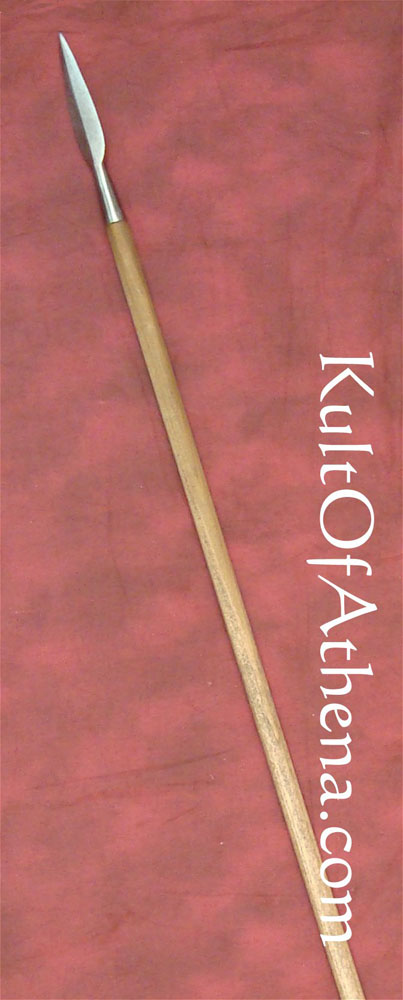 The Arms & Armor Greek Javelin has a cast tool steel head with an integral socket and has a flattened diamond cross-section. It is mounted on a 3/4 wooden haft with a rivet through the socket. The weapon is approximately 50 inches long and comes with a sharp point.