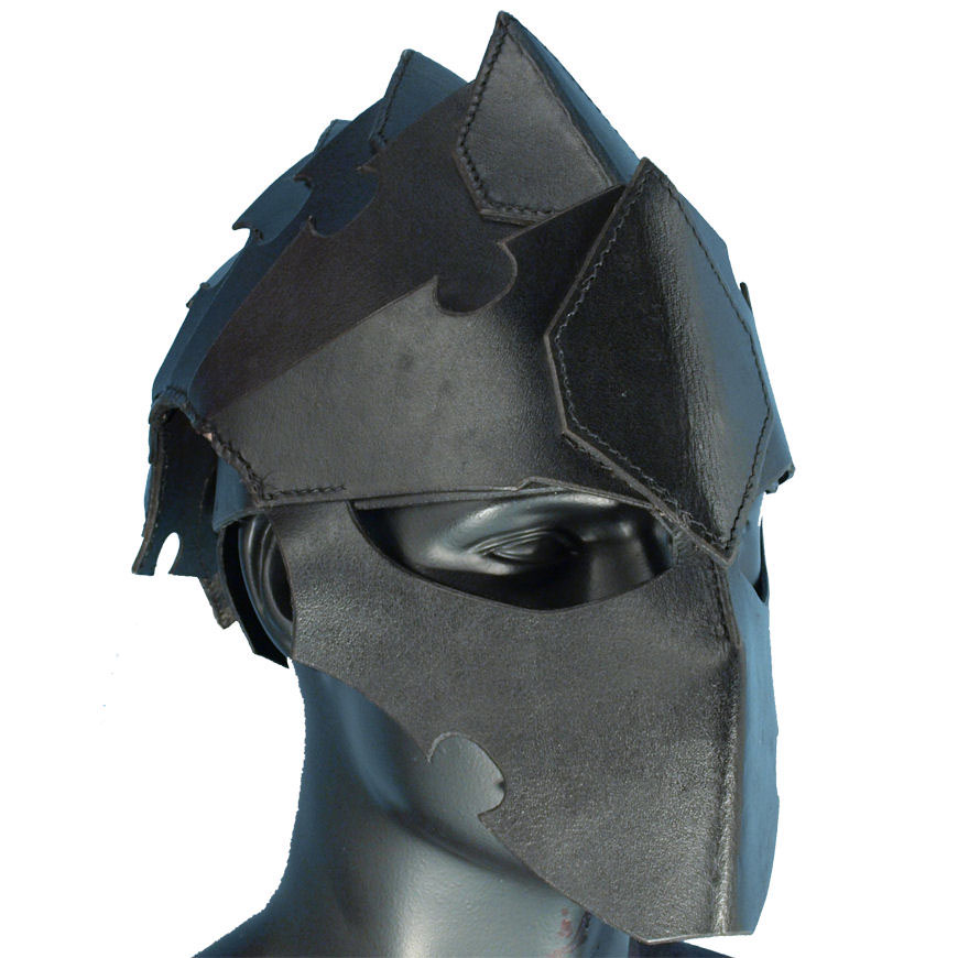 The Assassins Leather Helmet features a full face guard and a fully articultated top. The back of the helmet laces up to provide adjustable sizing from 22” and up.