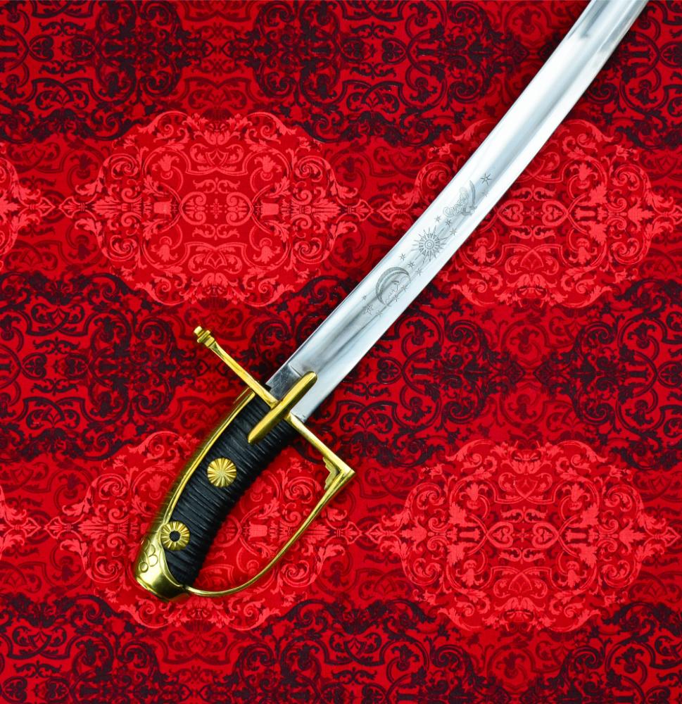 This Officers Saber of the Austro-Hungarian Hussars is made with a tempered high-carbon steel blade that has been etched with a sun, moon, saber and slogan. The blade, engraved in the fuller with latin reads: Andreas comes Hadik Generalis Campi Marschallus Excelsi Consily Aulae Bellici Supremus Praeses It identifies itself as the sword of Hadik, a General of warfare. The hilt is in brass with a ribbed leather grip embellished with stars of brass. The wood-core scabbard is covered in leather and ornamented in brass with two brass rings. The sword was made by Universal Swords of India.