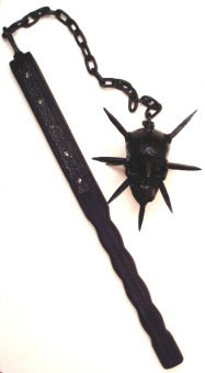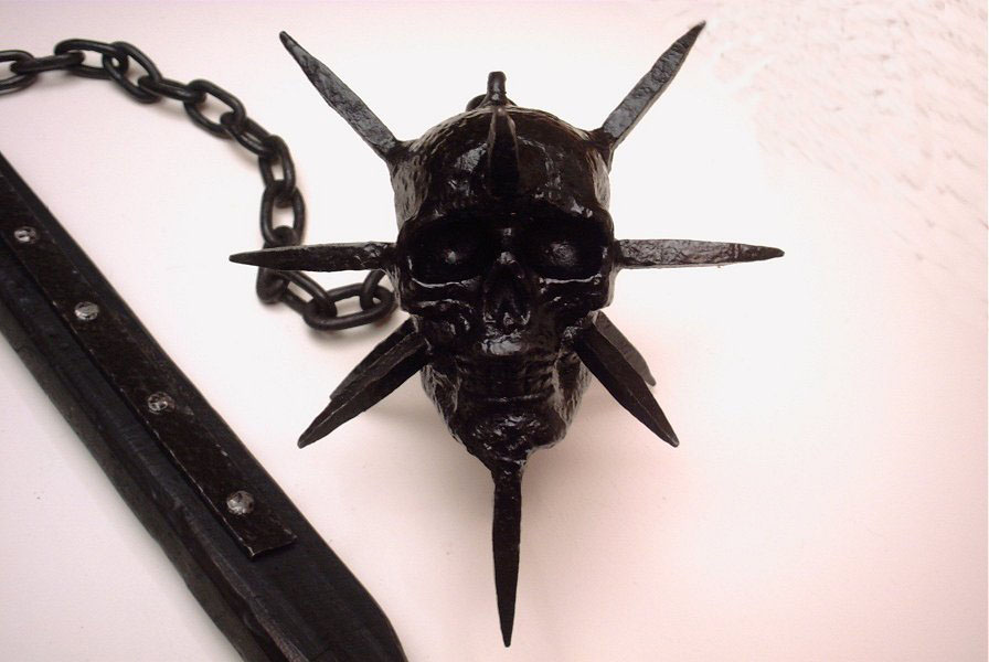 This hand crafted flail masterpiece features a blackened steel skull shaped ball with spikes over 2-1/2 inches long attached to a blackened chain which is linked inside a hand wrought blackened steel bar. The wrought iron bar of this medieval weapon is secured to a seared wood handle and has an overall extended length of over four feet!
