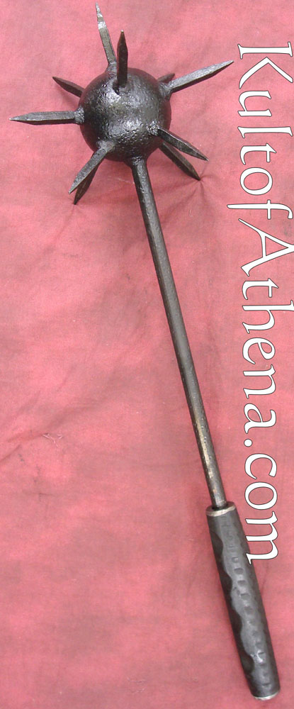 Deadly on every level Buy this at your peril – it personifies the term “Going Medieval.” Tipping the scales at 5 lbs., this is a lethal pole arm which demands respect. This mace bristles with 2-inch + spikes protruding menacingly from a solid, baseball-sized chunk of iron, securely attached to a 20-inch metal shaft which terminates in a strong, wood-covered handle. It is very well constructed, and could well be used in combat if one were actually strong enough to wield it. Roughly hewn, as it should be, this is a sword-breaking, shield-shattering, bone-crushing tool of destruction, and could be just as lethal to a careless handler as it is to an opponent. You have been warned.