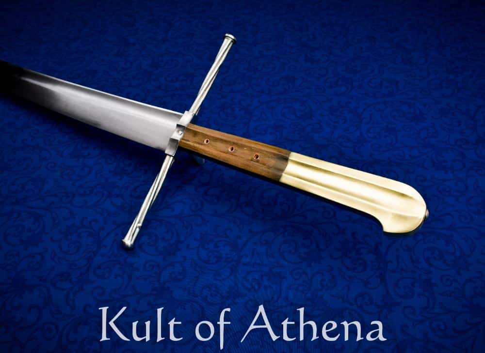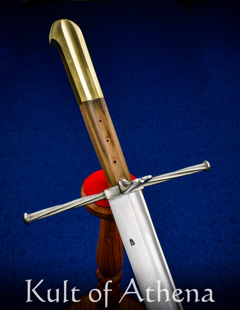 The blade is forged from sharp and well-tempered GB 60Si2MnA High Carbon Manganese Spring Steel. The hilt has a guard of stainless steel; its nagel is a separate component which extends through the crossguard. The grip is of smoothly polished black walnut wood and the long pommel which doubles as the second half of the grip is of well-cast brass. The tang of the blade is triple copper-riveted directly to the wooden grip and then further secured with a wide peen over the brass pommel. The Kriegsmesser is matched with a wooden scabbard with a tight wrap of leather and a solid cast brass chape and locket.