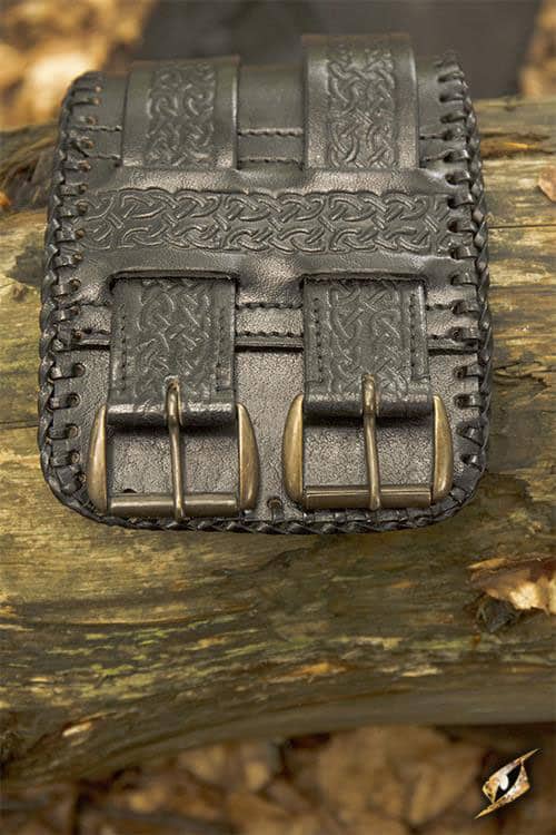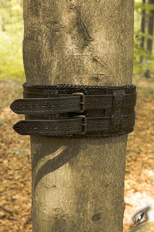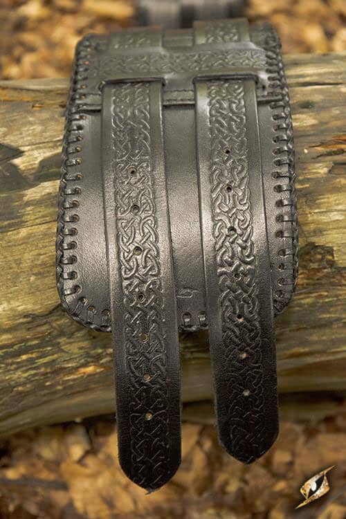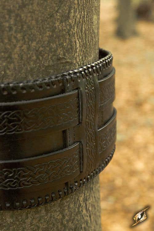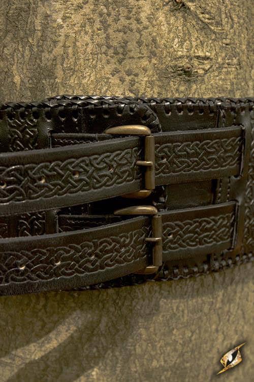 This Barbarian Belt is crafted from thick, quality leather which is thoroughly embossed with knotwork design. A wide band of leather, its dual straps and antiqued brass buckles adjust it to size.