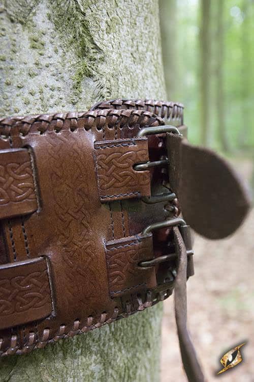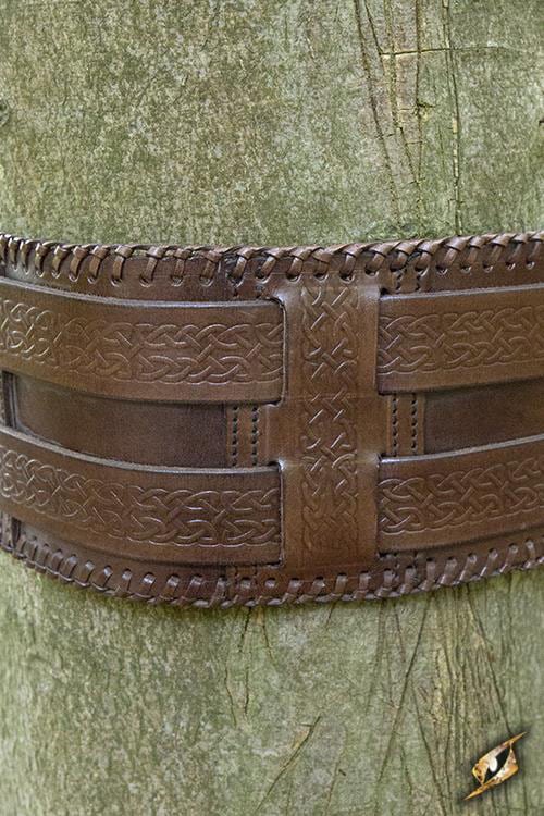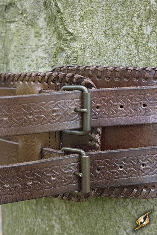 This Barbarian Belt is crafted from thick, quality leather which is thoroughly embossed with knotwork design. A wide band of leather, its dual straps and antiqued brass buckles adjust it to size.