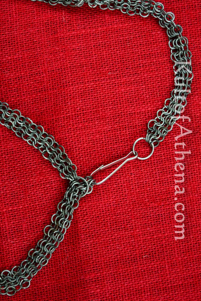 This plate and chainmail top and bottom set is made from 18 gauge steel and small links of butted round mail. They are highly adjustable to size and removing links effectively reduces size if needed, whilst adding links or even larger rings (such as round keyrings) of your own can enlarge them. The top has a simple spring clasp to fit the chain bands to and can be used to clip onto a group of rings to select a size anywhere on the chain bands. The bottoms do not have such a clasp but will require a similar clasp of your own ( or another form of closure such as a small carabiner ring or simple tie cord ) to function.