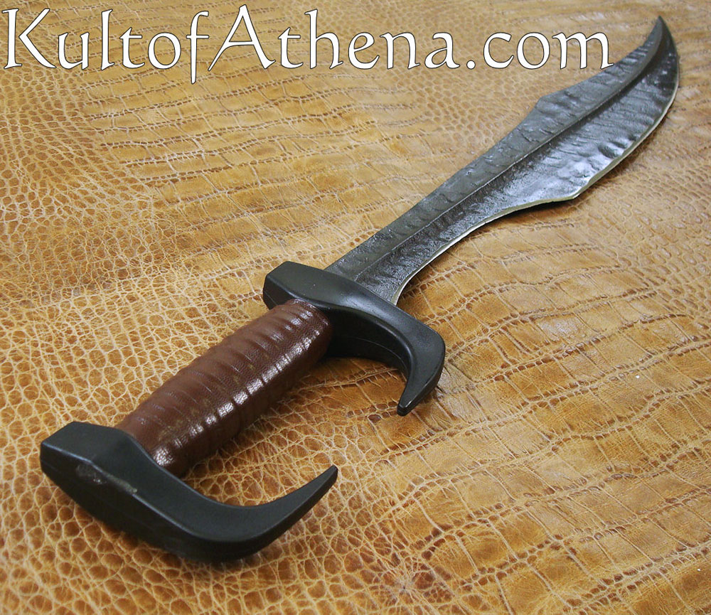 This fantasy battle-worn Spartan Sword has a moderately sharp blade of carbon steel that has been given a forged and roughened appearance. The guard and pommel are of hard polypropylene and the grip has been wrapped with strips of brown leather. Comes with a black leather scabbard that can be closed with steel buttons – it also has an integrated hanging strap.